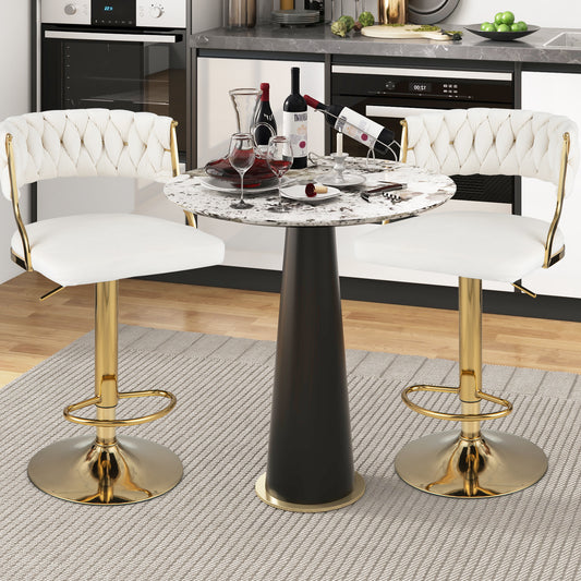 2 Pieces Velvet Swivel Bar Stools with Woven Back and Gold Metal Base for Island or Cafe Seating - White