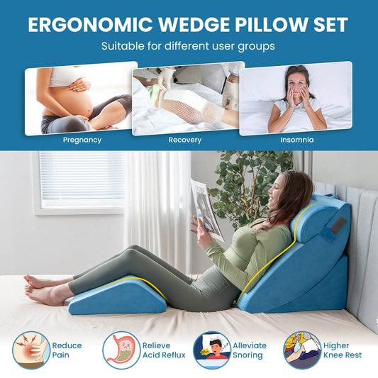 4 Piece Ergonomic Orthopedic Bed Wedge Pillow Set for Neck, Back, and Leg Pain Relief