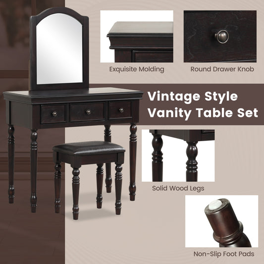 3 Drawer Makeup Vanity Table with Cushioned Stool and Removable Mirror – Walnut
