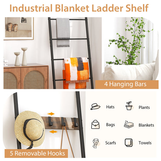 5-Tier Wall-Leaning Blanket Ladder with Removable Hooks and Industrial Design