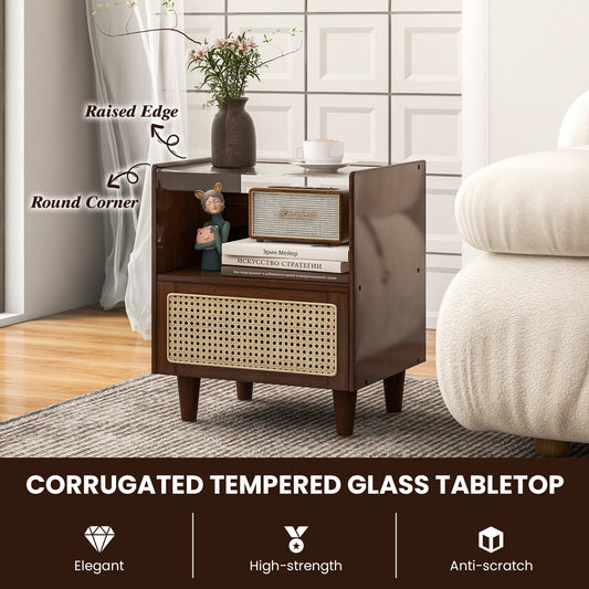 Bamboo and Rattan Nightstand with Drawer and Tempered Glass Top in Brown Finish