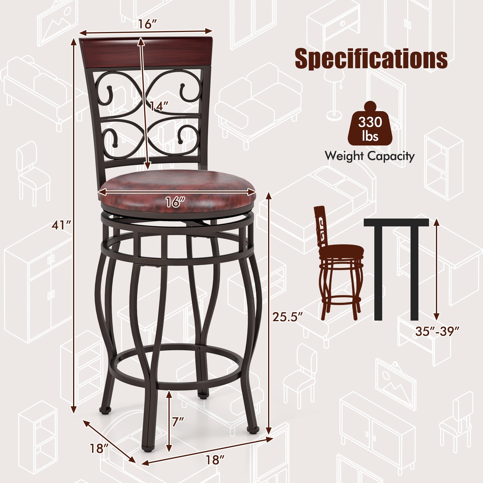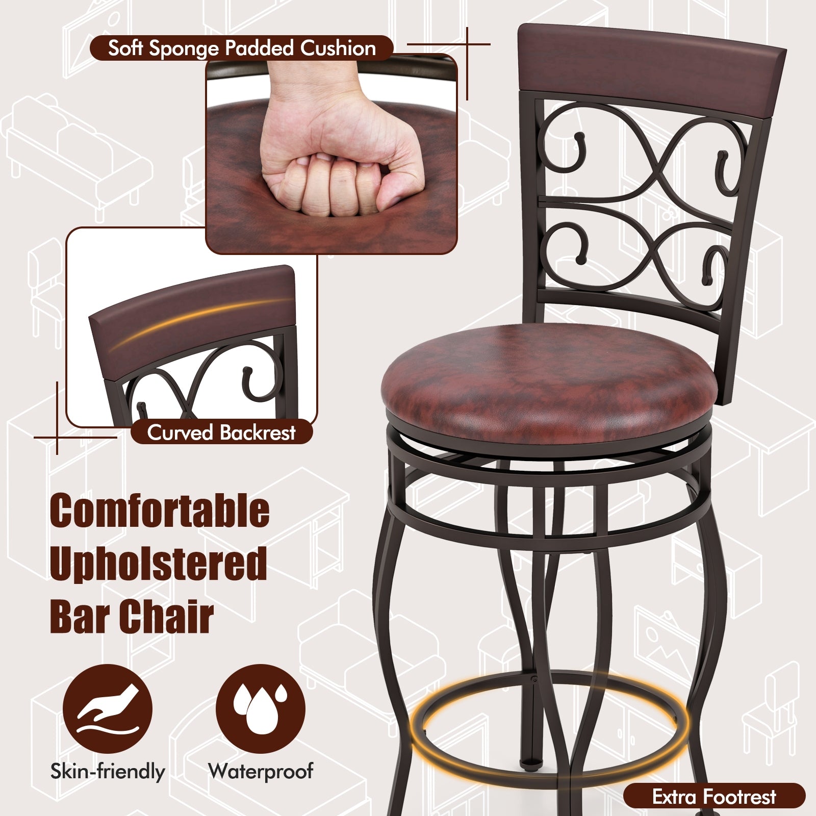 This vintage-inspired bar stool set of 2 combines classic elegance with modern convenience. Featuring 360-degree swivel capability, comfortable footrests, and wide backrests, these stools are designed for relaxation and style. Upholstered with skin-friendly PU leather and cushioned with high-resilience sponge, they deliver a superior sitting experience. The sturdy metal frame with anti-rust powder coating ensures long-lasting durability, while non-slip foot pads protect your floors and enhance stability. Ideal for kitchens, bars, and living rooms, these bar stools bring both charm and function to any space.