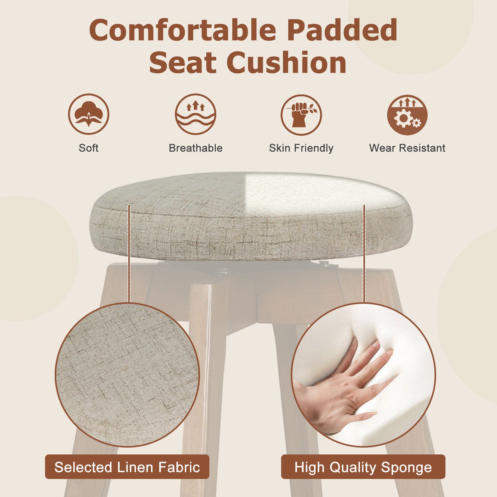 Upgrade your kitchen or dining space with this set of 2 swivel bar stools designed for both style and function. Featuring a 360-degree swiveling seat, these stools allow effortless movement and conversation. The padded cushions are wrapped in soft, breathable linen fabric and filled with high-density sponge for lasting comfort. Built with a solid rubber wood frame and supported by non-slip foot pads, each stool offers excellent stability and floor protection. The backless design allows for easy storage under counters, making them ideal for kitchens, bars, or dining areas with limited space.