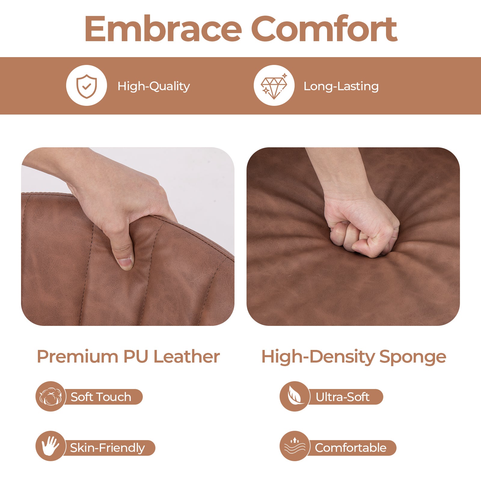 High-Quality Materials: The stools are upholstered in premium PU leather that feels comfortable and skin-friendly while being easy to clean. Filled with elastic high-density sponge, the seats provide a soft and supportive touch for a cozy seating experience.