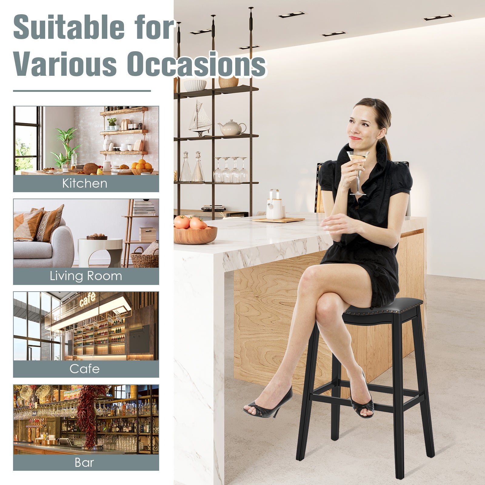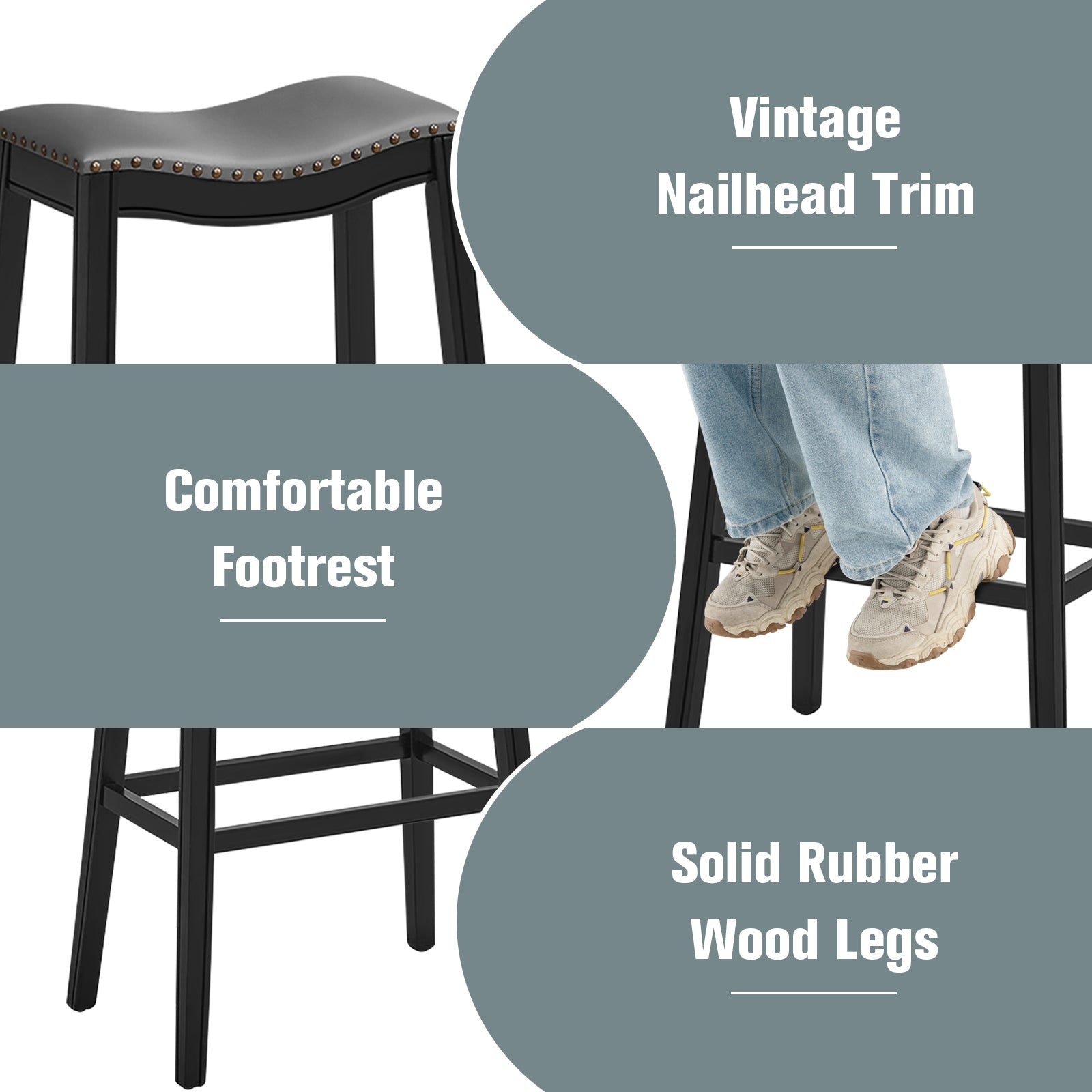 This set of saddle bar stools combines sturdy craftsmanship with modern elegance to elevate any kitchen or bar space. Built with a strong rubber wood frame and topped with foam-padded, PVC leather-covered seats, these stools offer durability, comfort, and easy maintenance. The ergonomic saddle shape and footrests provide enhanced relaxation, while the rivet-trim design adds a touch of sophistication. Easy to assemble and designed for versatile use, these stools are a stylish and practical addition to any setting.