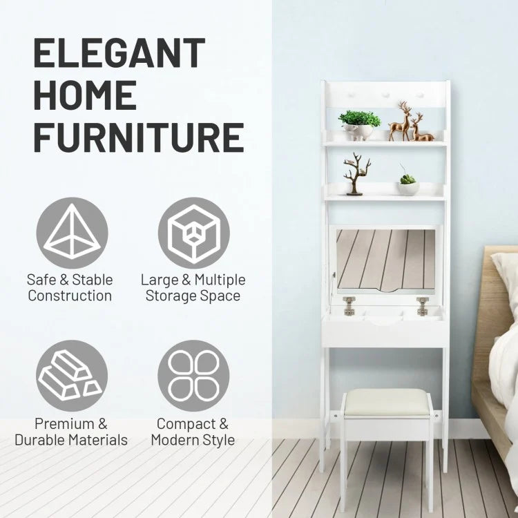 This versatile vanity table set is designed to meet the needs of modern living spaces, offering an elegant and functional solution for small areas. Combining a makeup table, writing desk, and bookshelf, it provides abundant storage options and a sleek look. The large flip-top mirror provides a clear, broad view of your reflection, while the cushioned stool offers comfort for extended use. Whether you need a vanity table, a workspace, or a decorative storage area, this set is an ideal choice for maximizing space without compromising style.