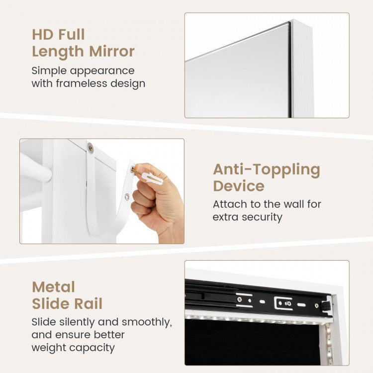 This 3-in-1 freestanding jewelry cabinet combines a full-length mirror, spacious storage, and a coat rack into one space-saving solution, ideal for modern living. With built-in 3-color LED lighting, a 360° swiveling base, and a frameless mirror design, it brings convenience and elegance to your daily routine. The cabinet is built for security and durability with a smooth metal slide rail and an anti-toppling device, making it perfect for bedrooms, apartments, or dorm rooms.