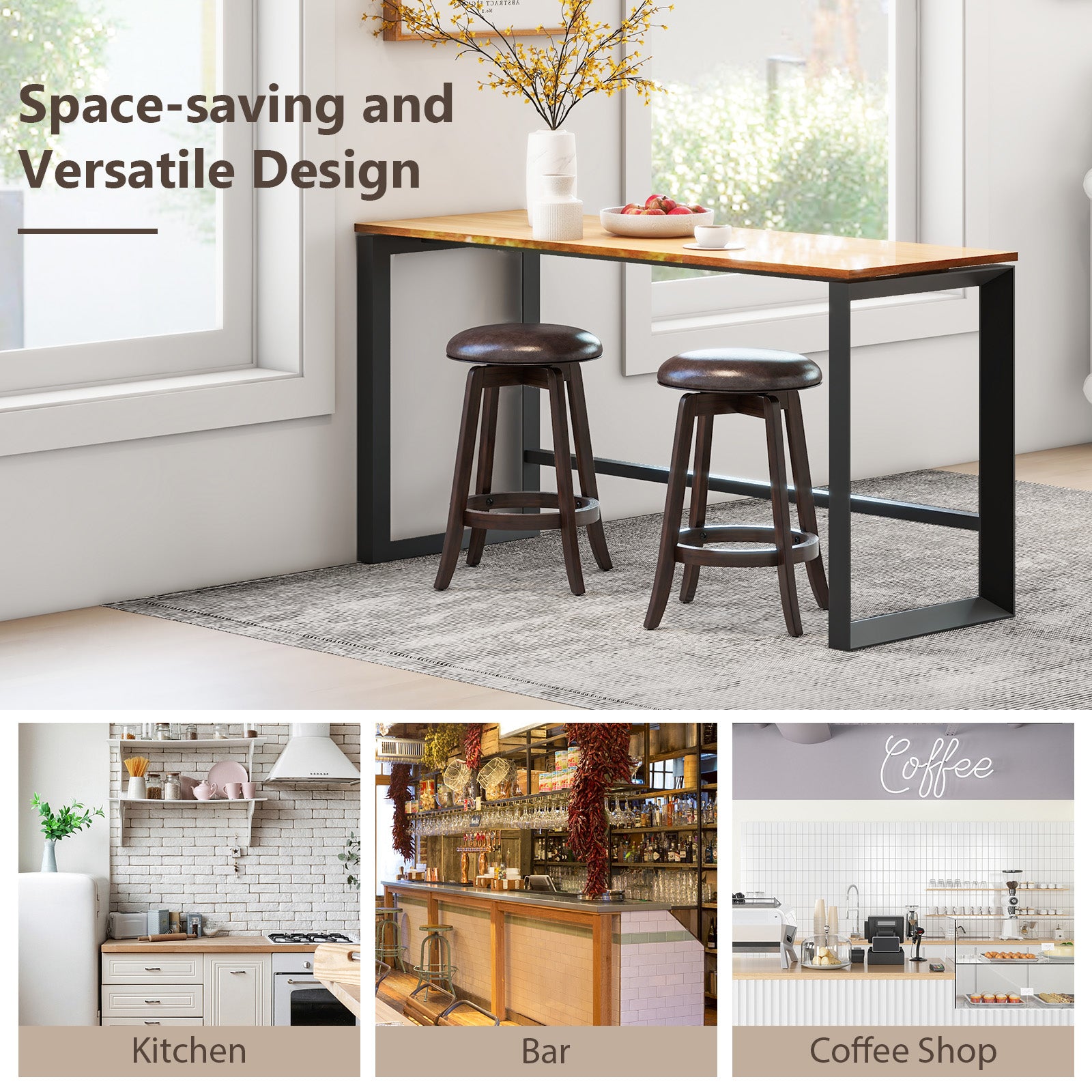 360° Swivel Design: These bar stools feature a 360° swivel seat, allowing easy rotation and making it ideal for socializing. This function allows for easy access to items and interaction with people from any direction.