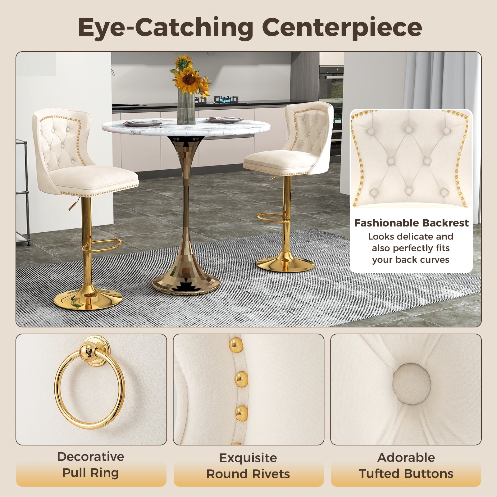 Enhance your kitchen, dining room, or bar with this set of adjustable velvet bar chairs. Upholstered in soft Dutch velvet and filled with high-density sponge, these stools combine luxurious comfort with ergonomic support. Designed with a 360° swivel seat and height-adjustable base, they offer personalized seating for any occasion. The electroplated metal base with anti-slip ring ensures lasting stability, while decorative accents like tufted buttons, rivets, and a pull ring add refined charm to your space.