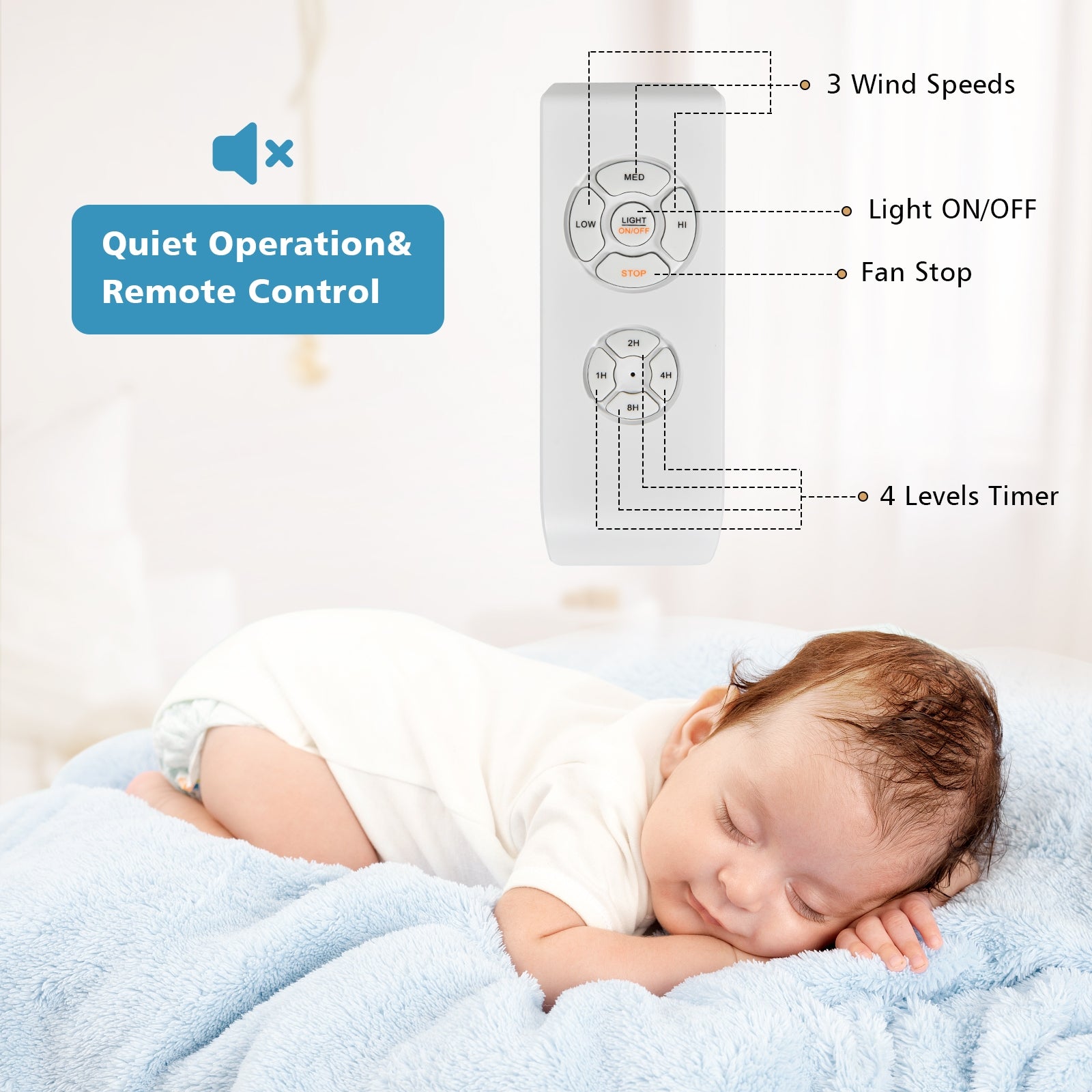 Remote Control: Effortlessly control the light and fan speed from a distance with the included remote control.
