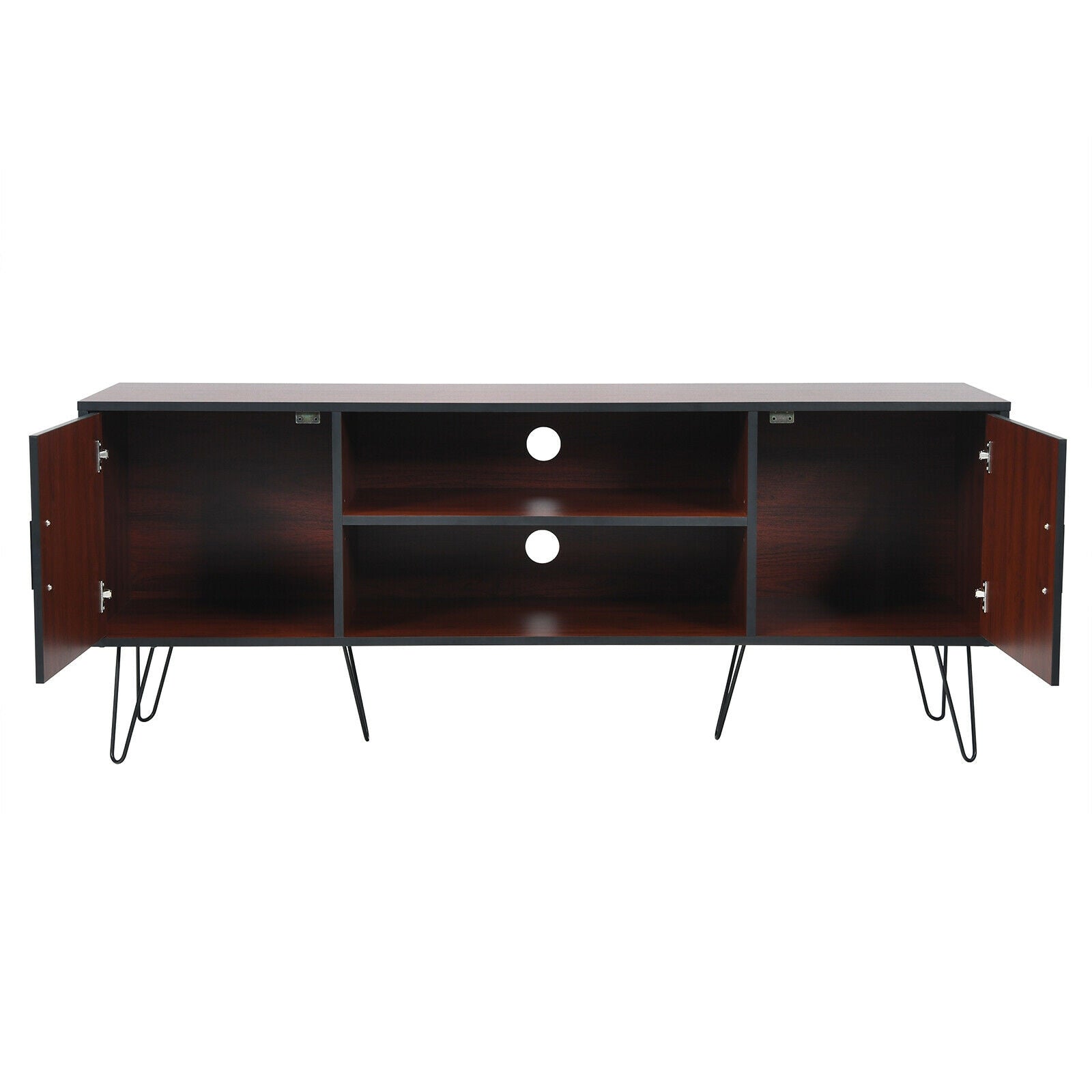 Add refined functionality to your entertainment space with this versatile 59 inch TV stand. Designed to hold flat-screen TVs up to 65 inches, it blends vintage charm with modern practicality. Crafted from durable engineered wood and supported by six powder-coated metal legs, the stand offers lasting strength and an elevated, easy-to-clean profile. Two enclosed cabinets and open center shelves provide ample storage, while adjustable shelving and cable management features ensure an organized setup. Its wood grain finish and clean lines make it a timeless addition to living rooms, bedrooms or offices.