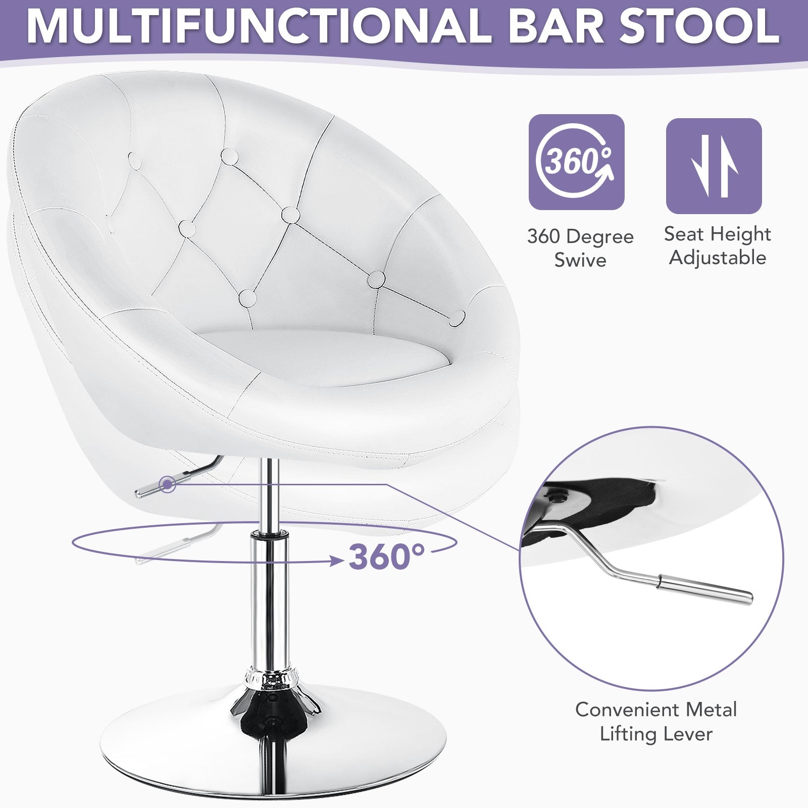 This Round Tufted Back Accent Barstool blends comfort, style, and versatility, making it a perfect addition to your bar counter, dining area, or office space. With a solid chrome frame, ergonomic design, and cushioned seat filled with high-density sponges, this stool provides a supportive and pleasant seating experience. Its contemporary look, combined with practical features such as adjustable height and 360-degree swivel, makes it ideal for both residential and commercial use.