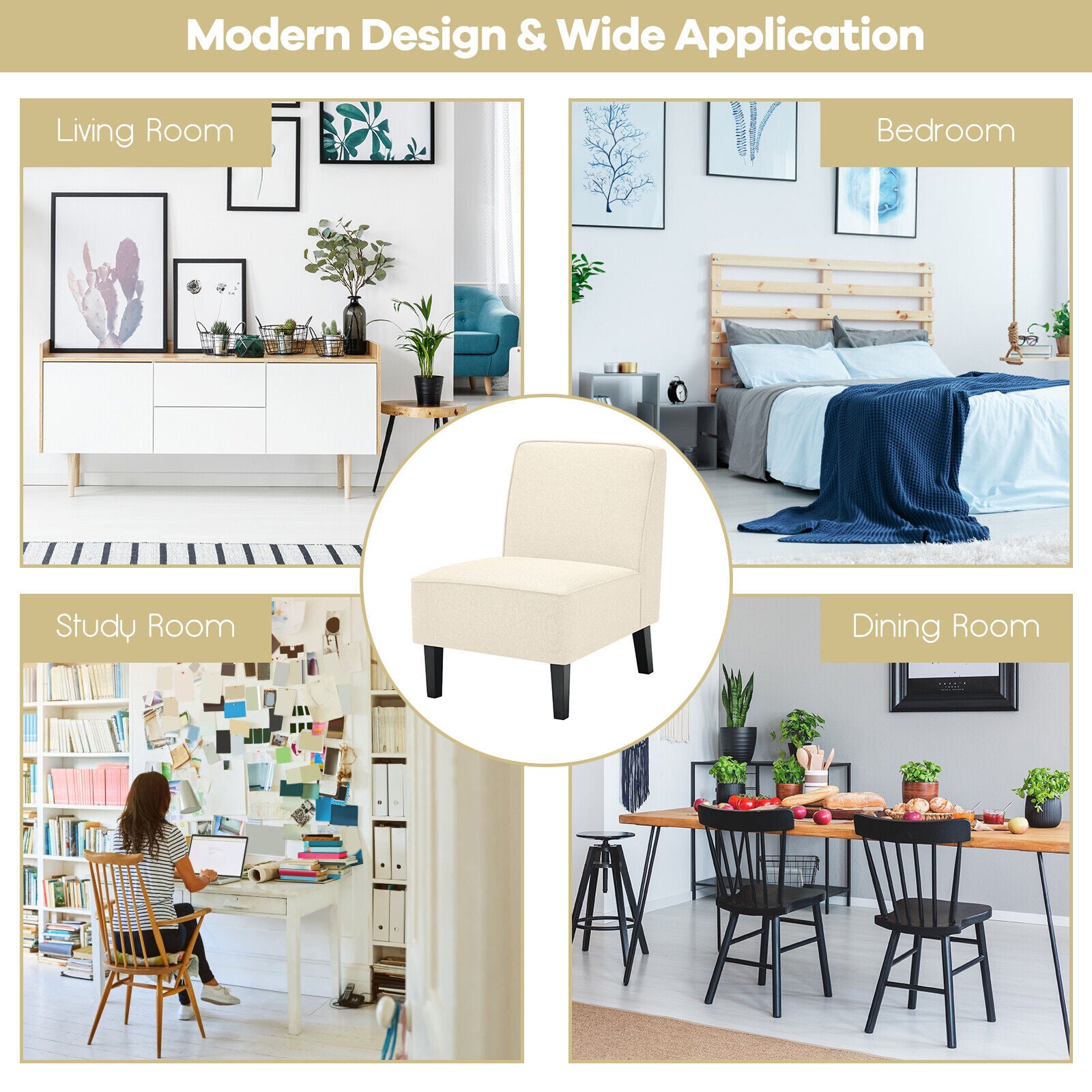 This armless accent chair combines comfort, durability, and modern elegance, making it a perfect addition to any room. With its breathable linen upholstery, thick cushioned seat, and supportive backrest, it offers a cozy seating experience. The solid rubber wood frame and legs ensure long-lasting use, while non-slip pads protect your floors. Ideal for the living room, bedroom, balcony, or office, this chair effortlessly complements a variety of home decor styles.