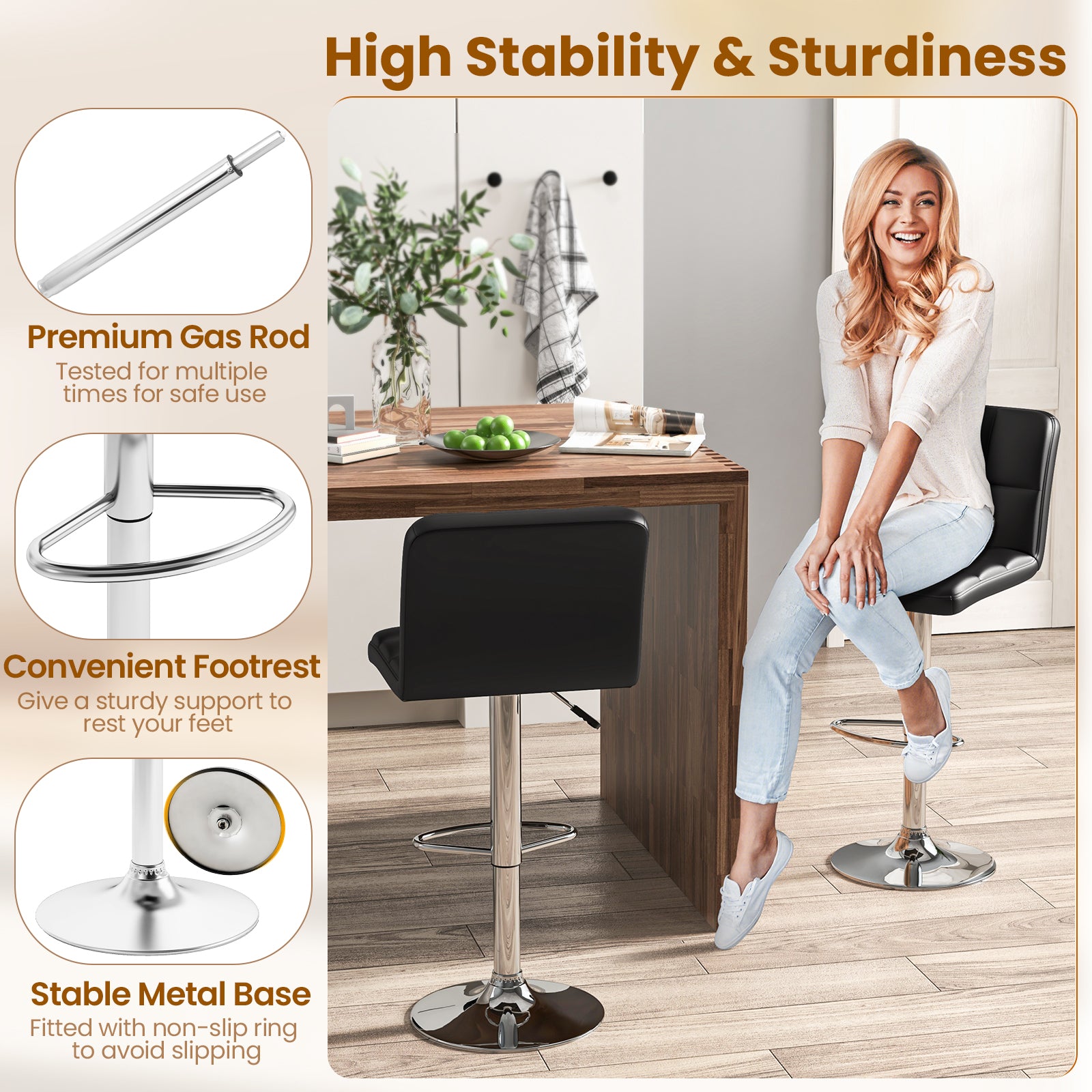 Upgrade your kitchen, dining, or bar area with these modern adjustable bar stools. Featuring a sleek and stylish PU leather seat, these stools offer a comfortable and resilient design with high-density sponge padding. Their height is adjustable from 25” to 33.5”, allowing them to perfectly fit various counters and bar tables. The 360° swivel function and supportive backrest with an integrated footrest make these stools ideal for extended socializing or dining sessions. Built with a sturdy electroplated metal base, these stools are designed for durability and easy maintenance.
