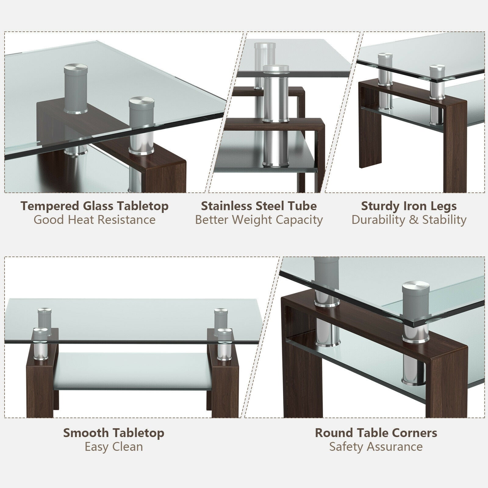 This modern coffee table is designed with a double-tier structure that provides ample storage space for various items, helping keep your room neat and organized. Its transparent tempered glass tabletop and frosted glass shelf offer enhanced heat and impact resistance, supported by sturdy iron legs and stainless steel pipe connections that ensure excellent stability. The sleek, smooth surface simplifies cleaning, while its simple and contemporary appearance complements any room style. The product comes with tools for hassle-free assembly.
