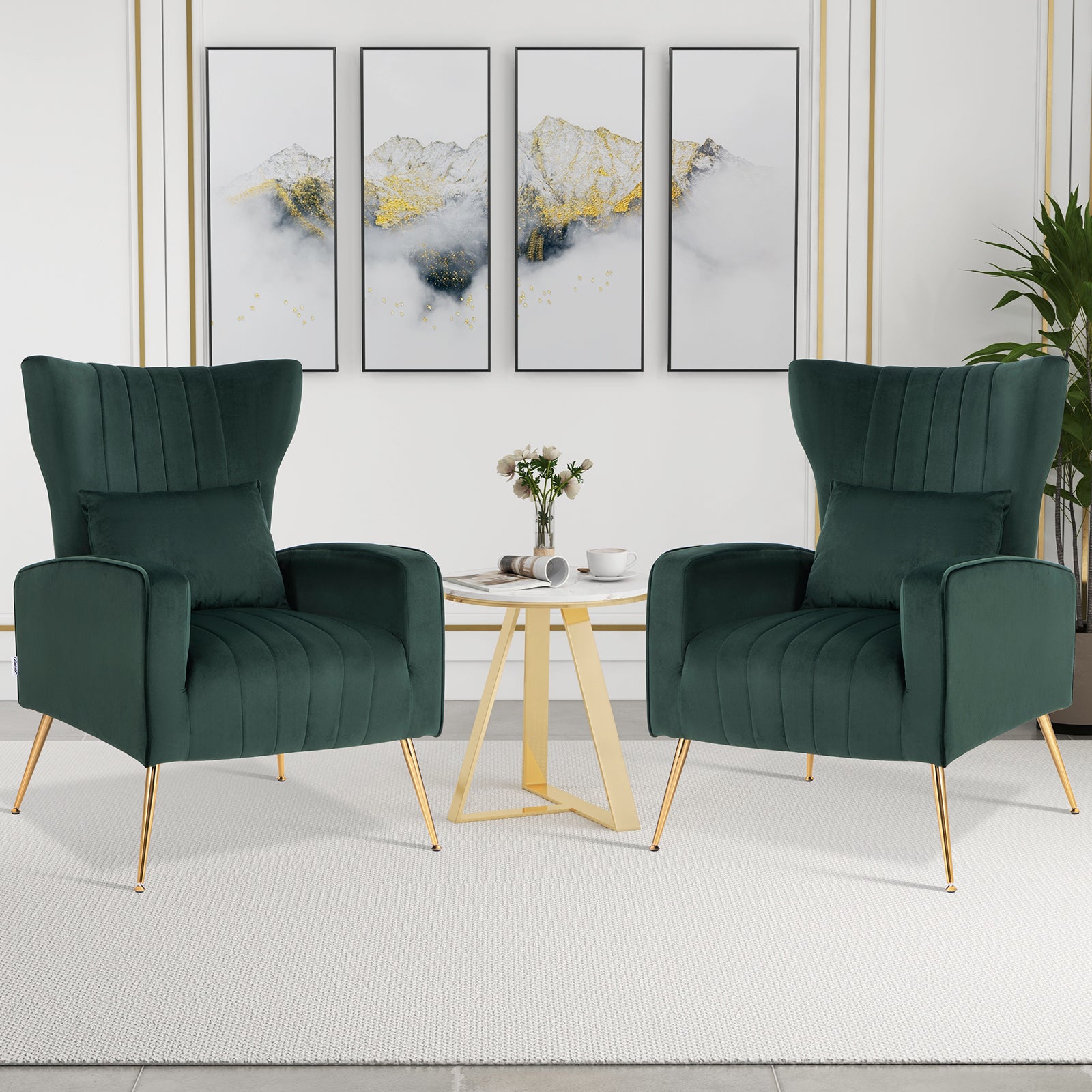 Elevate your interior with this stylish wingback accent chair designed for exceptional comfort and visual appeal. Upholstered in soft Dutch velvet and filled with resilient sponge, it includes a supportive lumbar pillow, spacious seat, and ergonomic armrests. The chair's heavy-duty metal legs with a golden finish ensure lasting stability, while the adjustable foot pads enhance balance on any surface. Perfect for relaxing, reading, or socializing, it brings elegance and comfort to living rooms, bedrooms, reception areas, and more.
