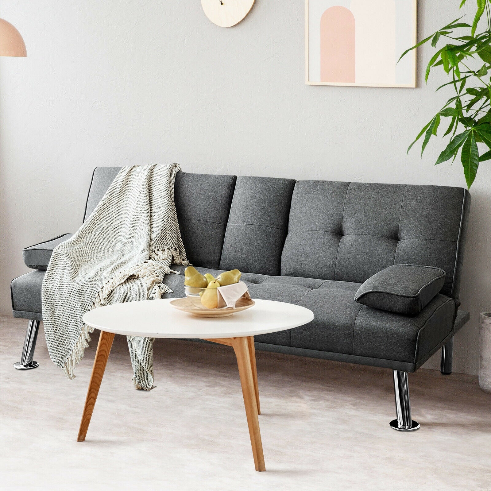 Convertible Futon Sofa Bed with Cup Holders and Adjustable Backrest, Linen Upholstery, Dark Grey
