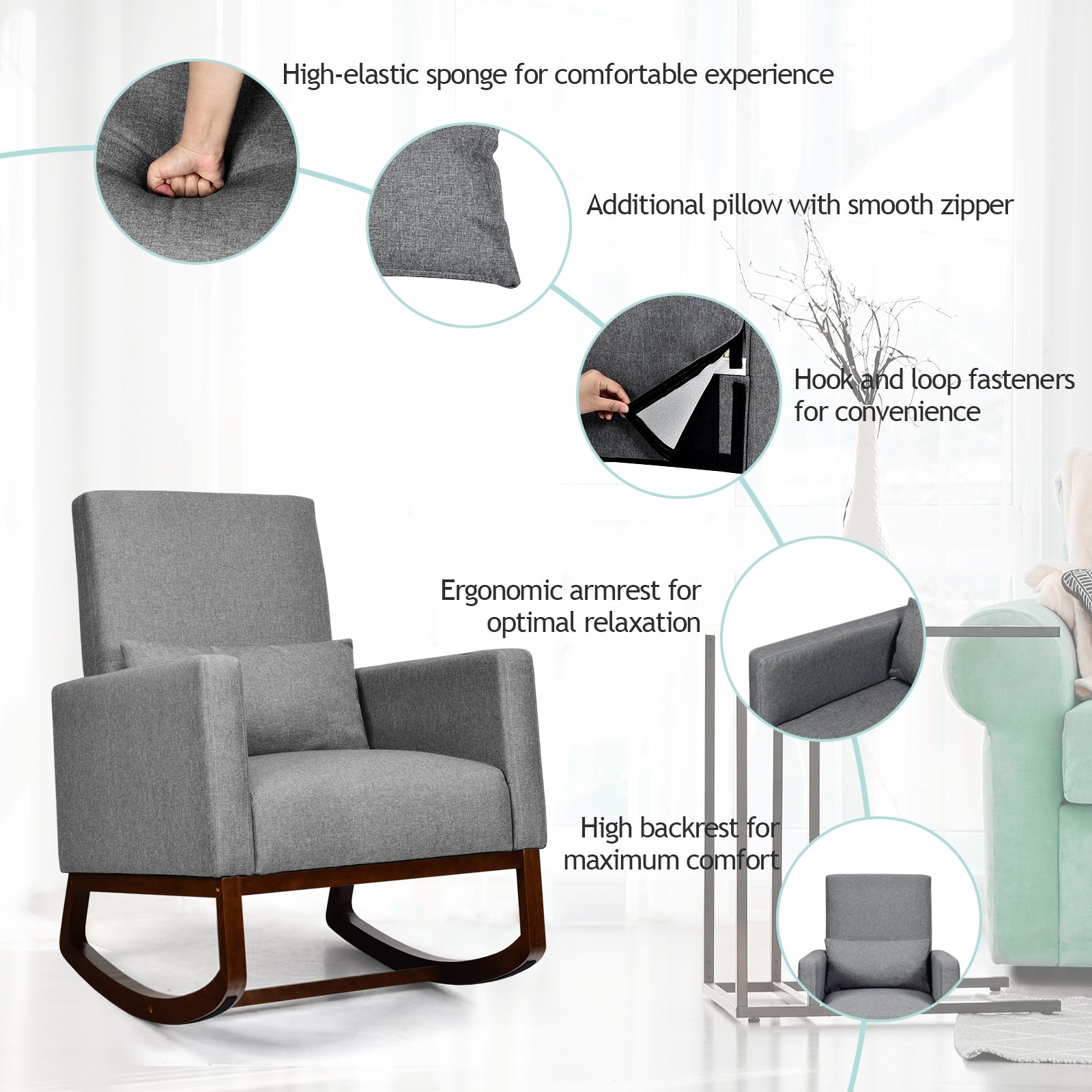Convertible Rocking Chair and Accent Armchair with Cushion and Pillow in Grey