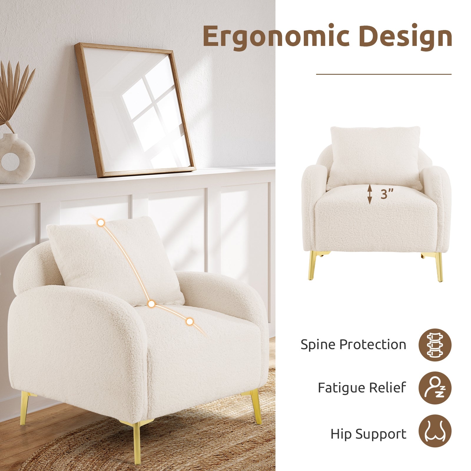 This modern accent chair blends cozy comfort with stylish design, making it a versatile addition to any space. Designed with a wide backrest, curved armrests, and a plush padded seat, it offers ergonomic support for relaxation. Upholstered in soft faux teddy bear fur, the chair provides a warm and inviting feel. With a sturdy metal base and non-slip foot pads, it is both stable and floor-friendly. Ideal for reading, lounging, or working, this chair fits seamlessly into living rooms, bedrooms, waiting areas, and more.
