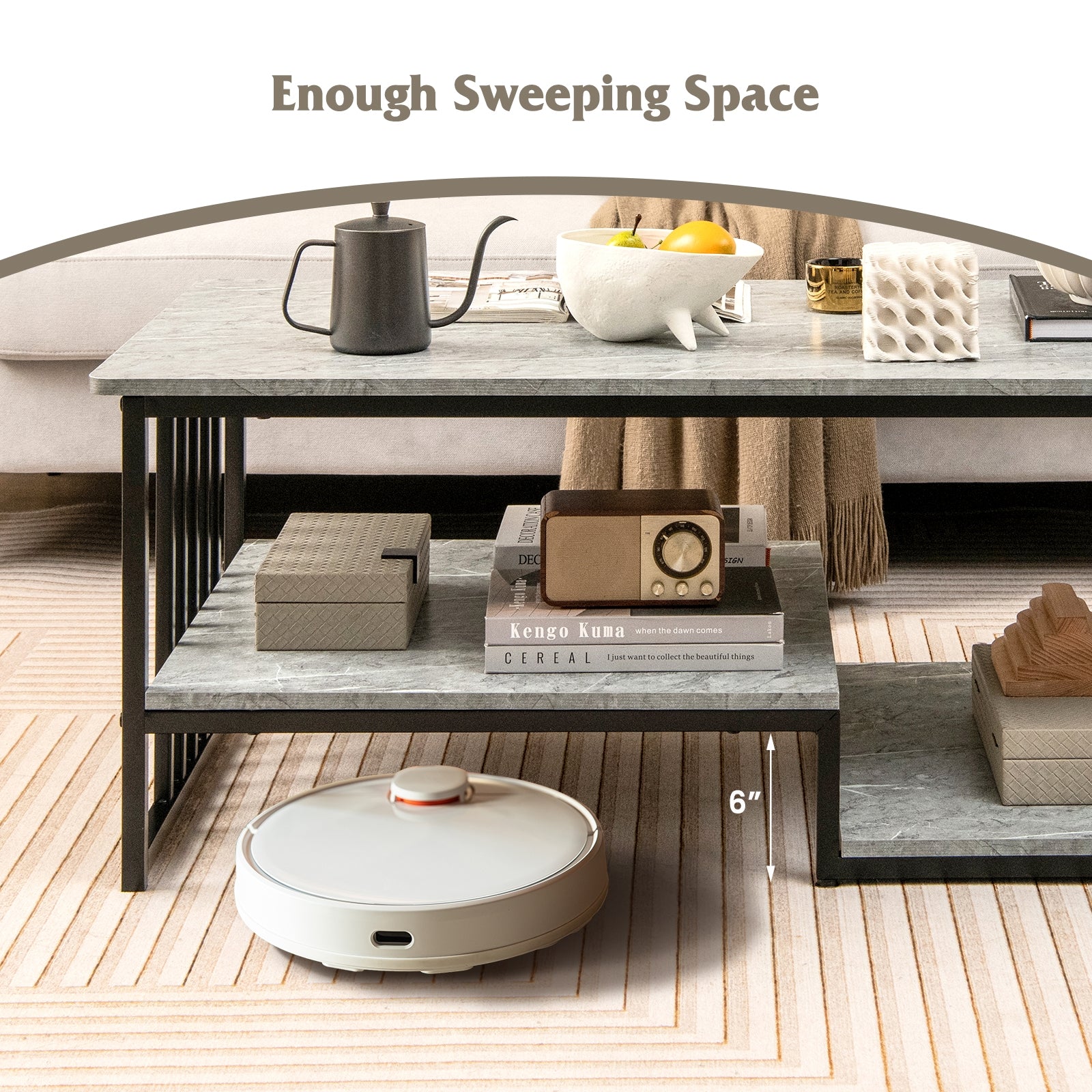 Safe and Functional Design: Rounded table corners prevent accidental injuries, making it a safer choice for homes with children or pets. The 6-inch clearance from the higher shelf to the ground provides easy access for cleaning underneath.