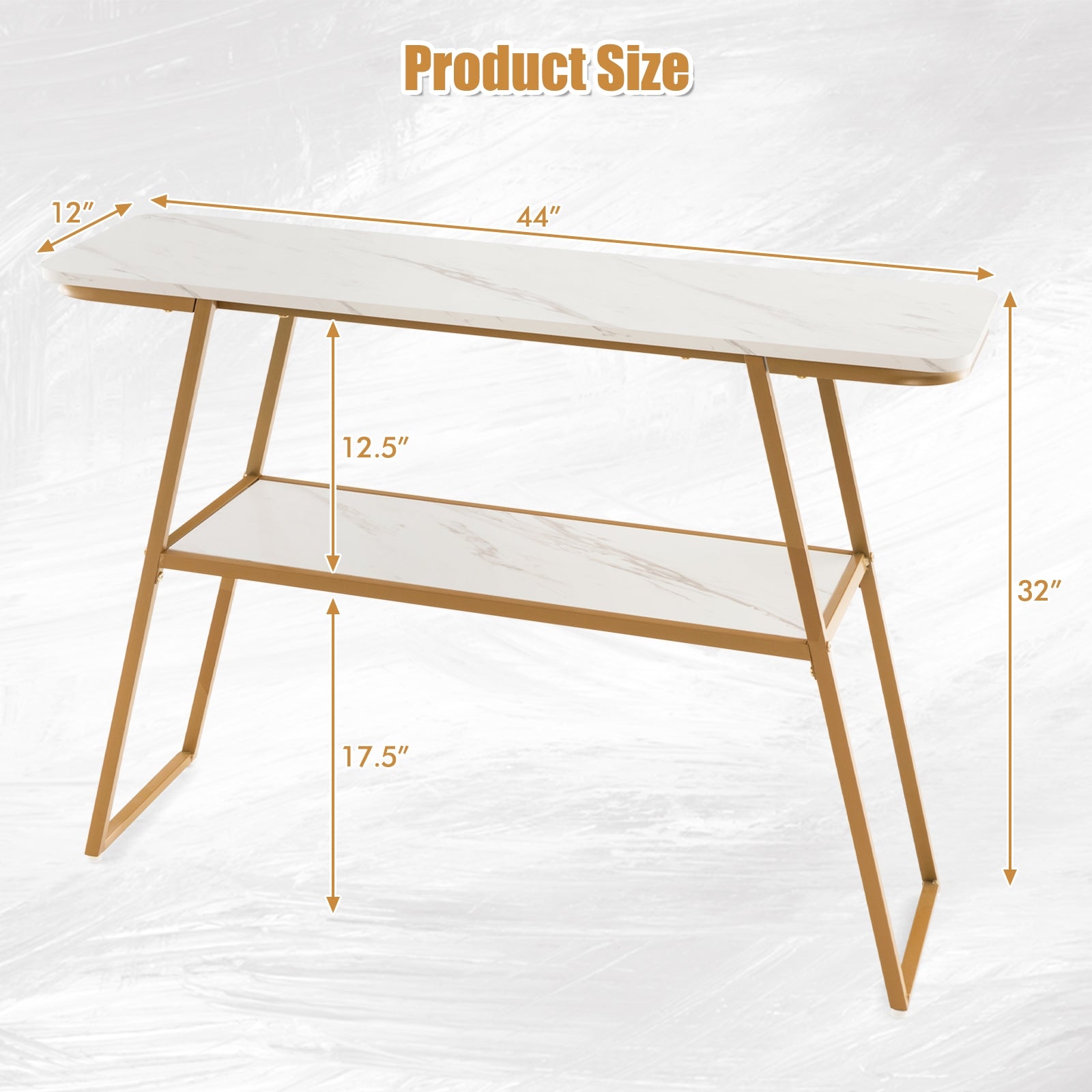 This chic faux marble console table brings a touch of modern elegance to any room in your home. With its luxurious white faux marble top, gold metal frame, and practical two-tier shelf design, it blends both style and function. The narrow profile fits effortlessly behind sofas, in entryways, or along hallways, making it a versatile solution for your display and storage needs. Durable, stable, and easy to maintain, it is a refined addition to any interior setting.