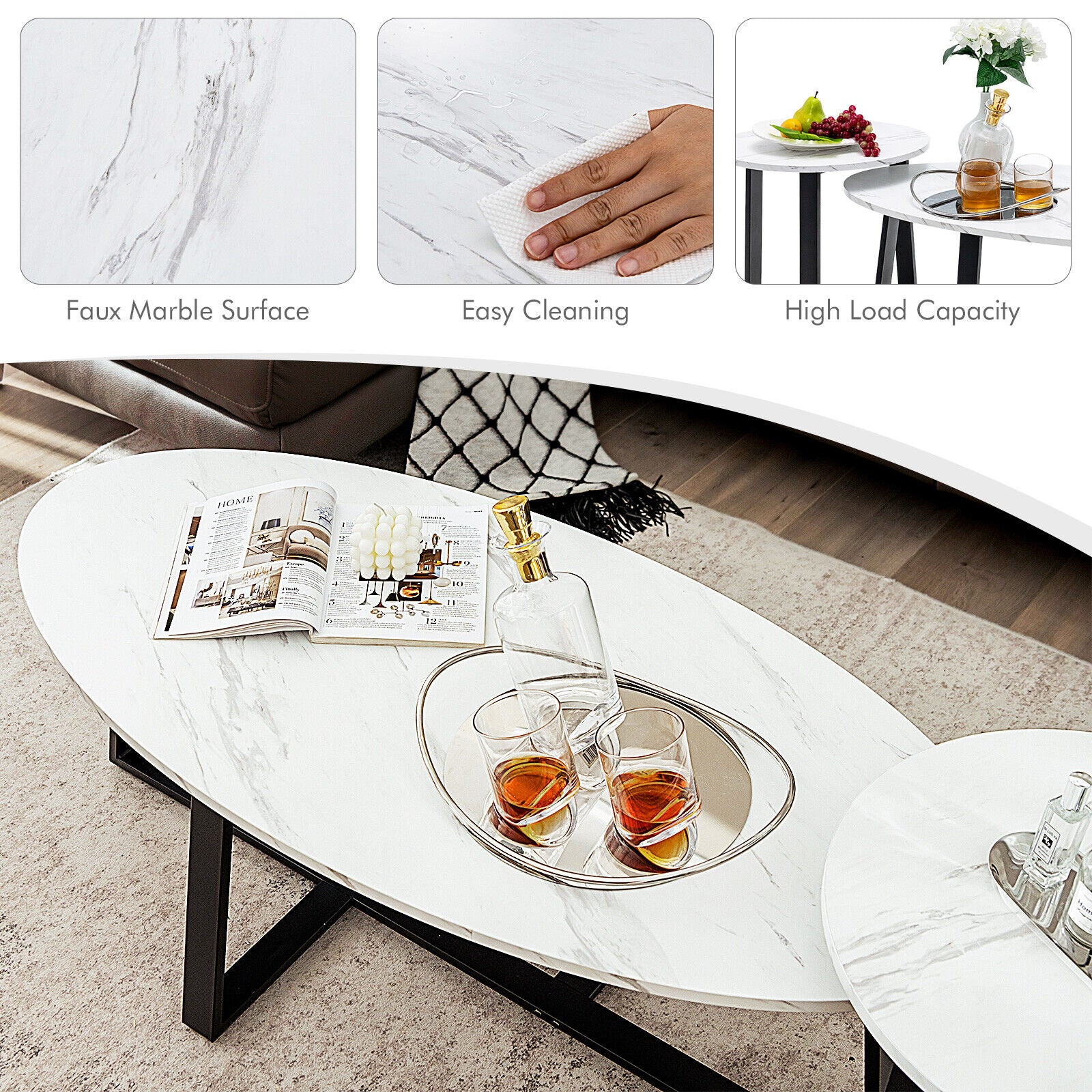 This 2-piece nesting coffee table set features a stylish combination of faux marble and black steel, bringing both elegance and practicality to your home. Designed with one oval table and one round table, the set can be used together or separately in a variety of rooms. The sturdy construction, ample surface space, and modern design make it an ideal choice for living rooms, bedrooms, offices, and more.
