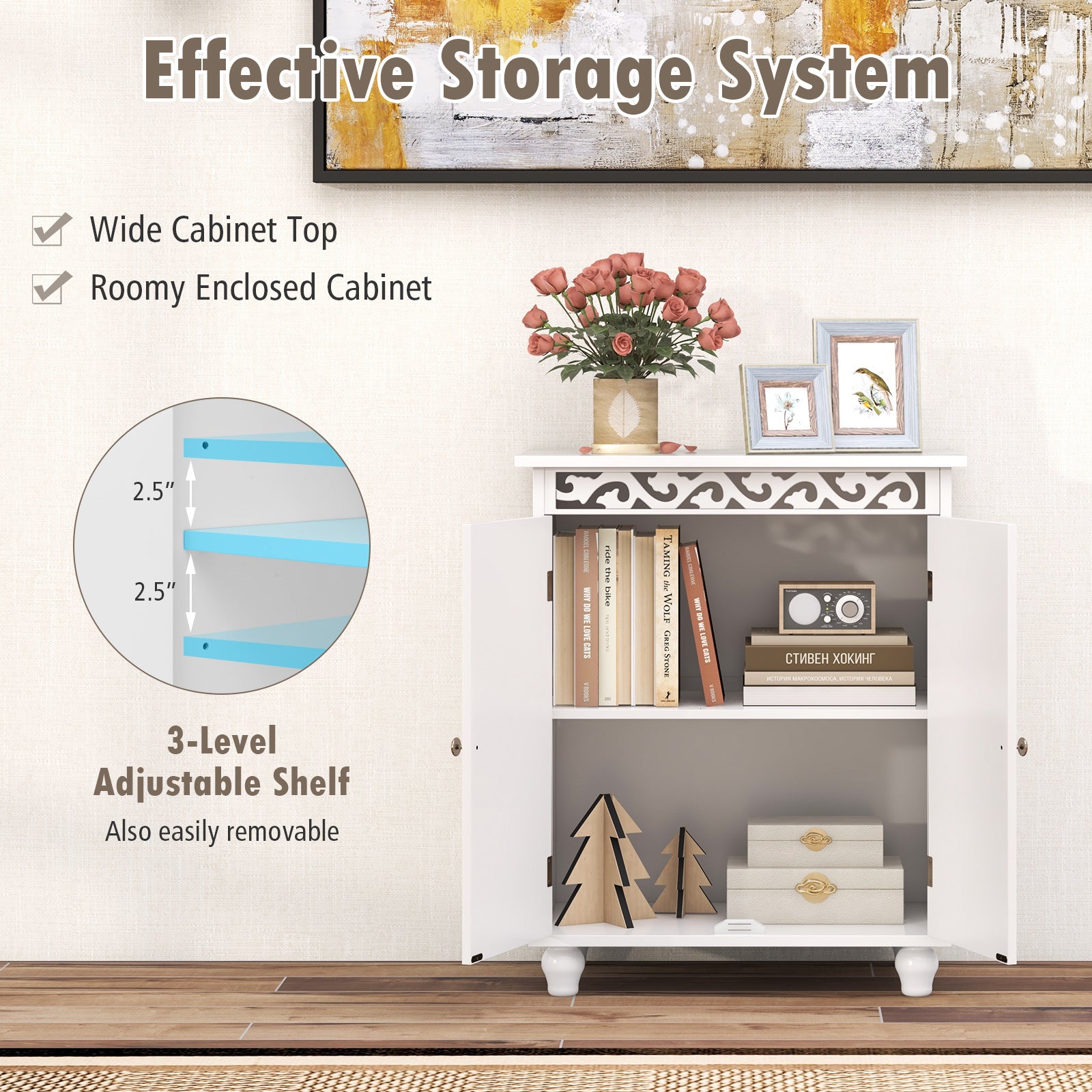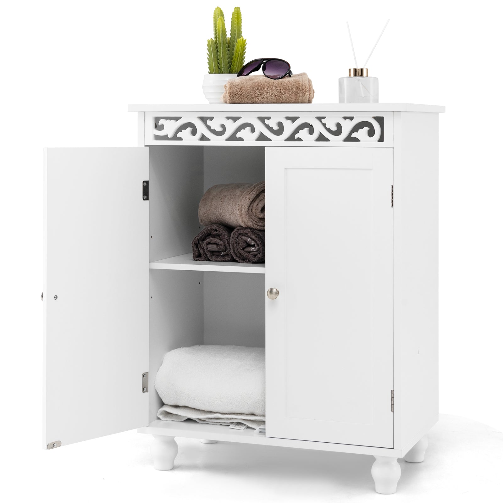 This elegant storage cabinet combines style and functionality. Featuring a wide top for displaying decorations, it offers a roomy enclosed cabinet with a 3 level adjustable shelf to accommodate various items. With anti-tipping kits for added security, solid wood legs for stability, and a smooth, painted surface for easy maintenance, this cabinet is a versatile piece for the bathroom, living room, dining room, and more. The exquisite carving patterns and magnetic catches for the doors enhance its sophisticated design.