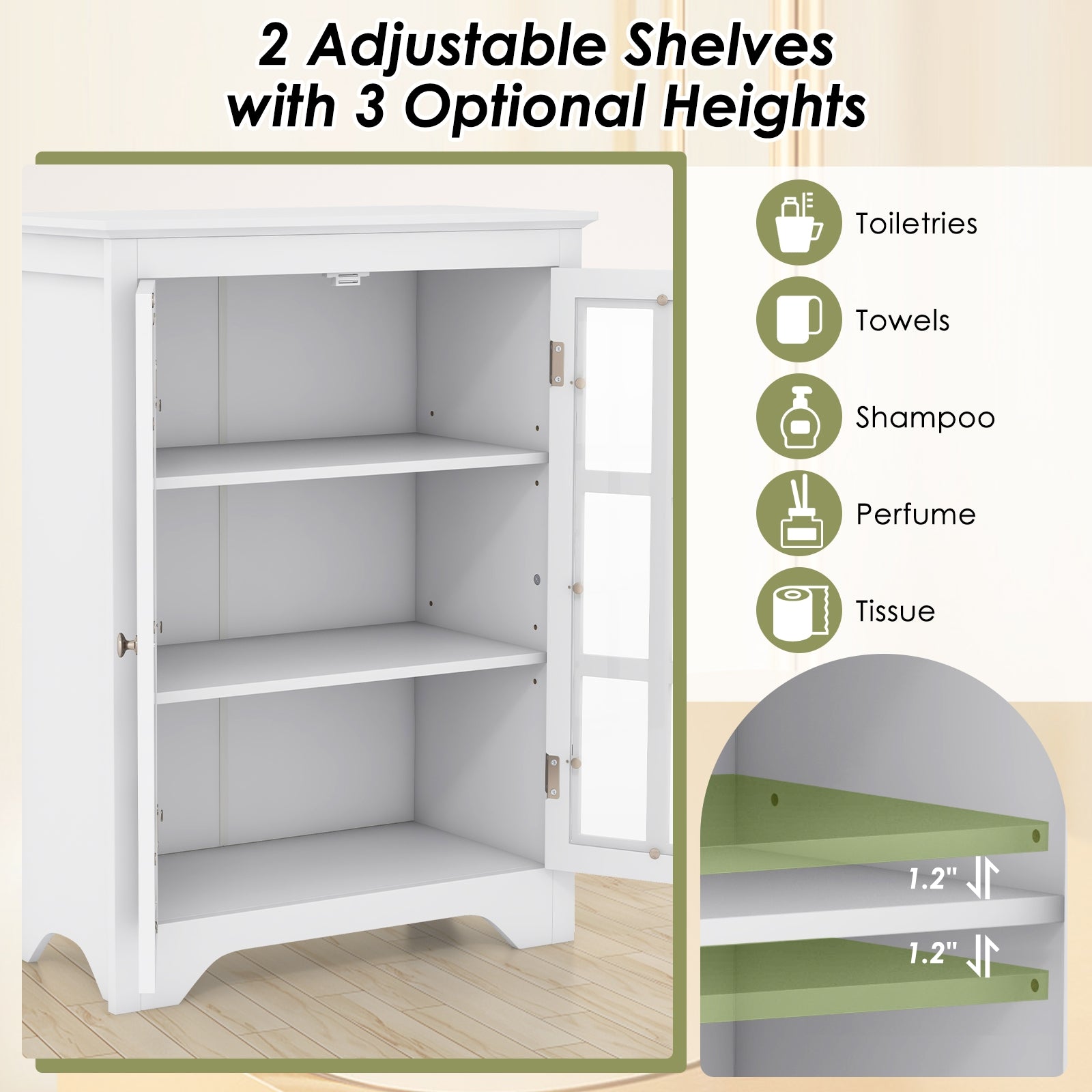 This sleek, modern bathroom floor cabinet combines practicality with style. Featuring a wide top and double glass doors, it provides an elegant and dust-free storage solution for your bathroom essentials. The cabinet includes 3 adjustable shelves to meet a variety of storage needs, while sturdy support legs ensure stability. With its anti-toppling device, non-slip foot pads, and magnetic catches, this piece offers both safety and convenience. Whether placed in the bathroom, living room, or hallway, its timeless design enhances any space.