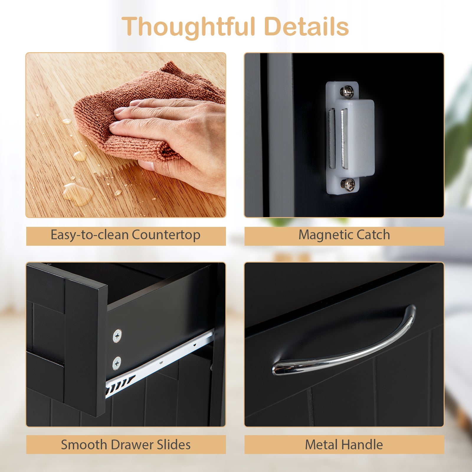 Functional Hardware and Easy Maintenance: The cabinet features durable metal handles, magnetic catches for secure door closure, and smooth drawer slides. The surface is easy to clean, making daily maintenance quick and simple.