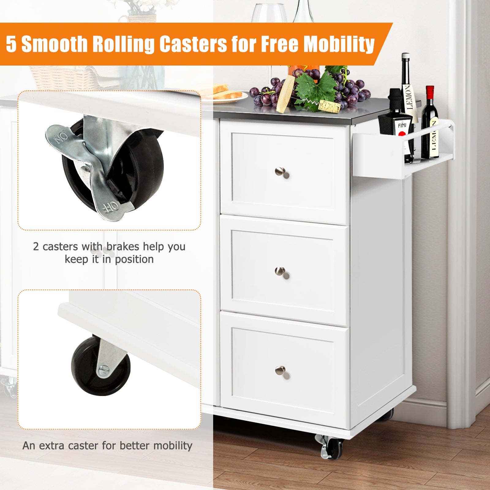This kitchen cart features a durable stainless steel countertop designed for long-lasting use and easy cleaning. Its wide surface provides ample space for food preparation, while two adjustable storage shelves accommodate various kitchen supplies. The cart includes three spacious drawers to keep items organized and classified. Equipped with five smooth-rolling wheels, including two with brakes, it offers excellent mobility and stability. Additional features such as a spice storage shelf and towel rack provide convenient access to essential items. Ideal for both kitchen and dining room, this cart helps maintain a neat and attractive environment.