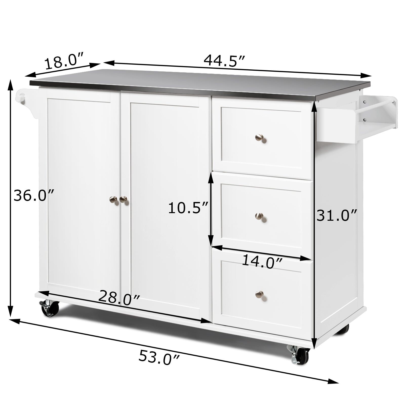 Kitchen Island with Stainless Steel Countertop 2-Door Cabinet and Drawers for Storage - White