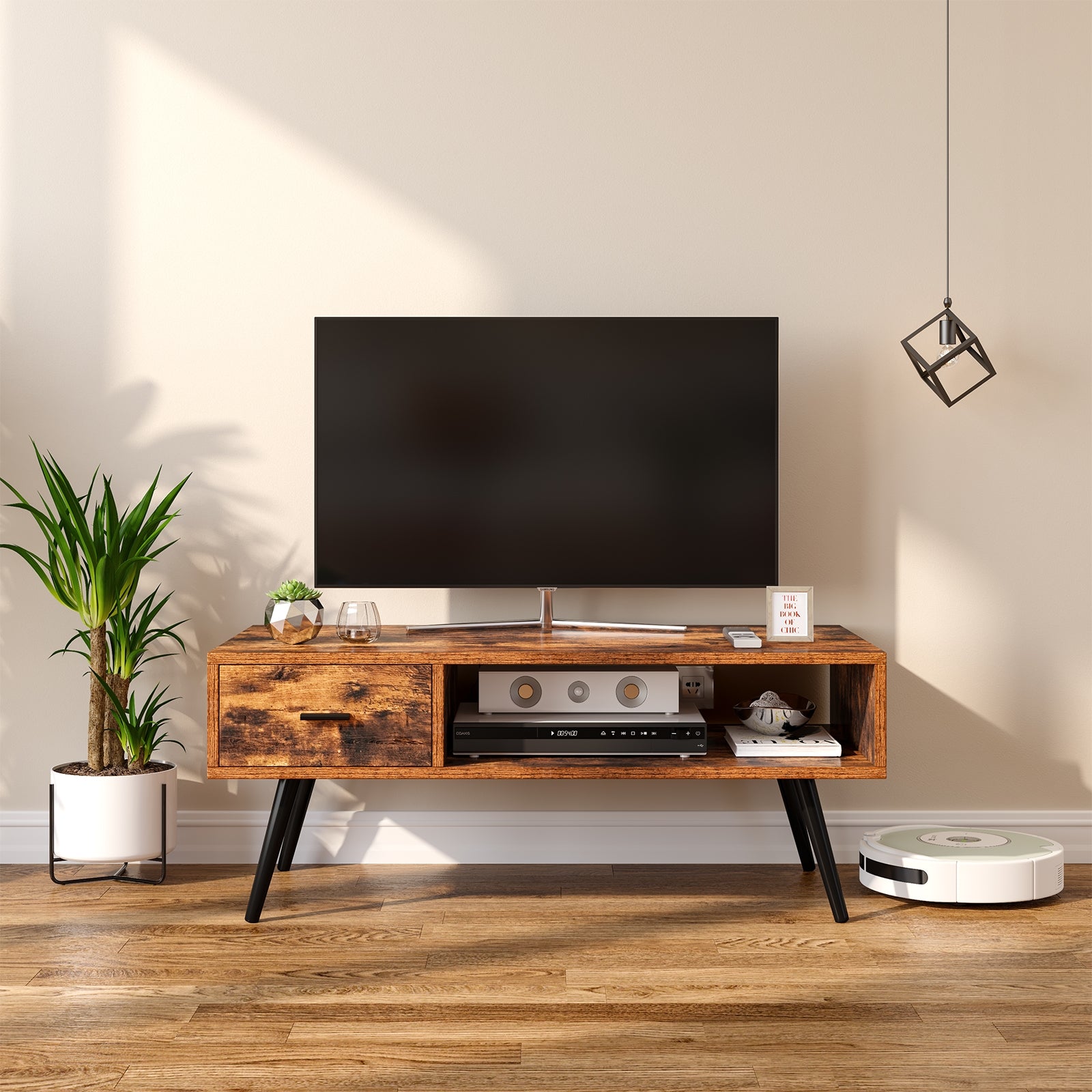 Add a touch of retro charm to your space with this mid-century modern coffee table. Designed with a spacious tabletop, a handy drawer, and an open lower shelf, this piece offers both form and function. Constructed with durable engineered wood and supported by solid pine legs, it provides excellent stability and long-lasting use. With its rustic brown finish and natural wood grain, this coffee table blends effortlessly into any room décor, making it ideal for your living room, bedroom, or office.