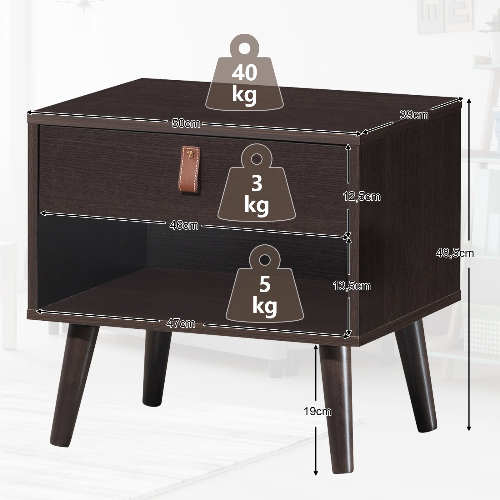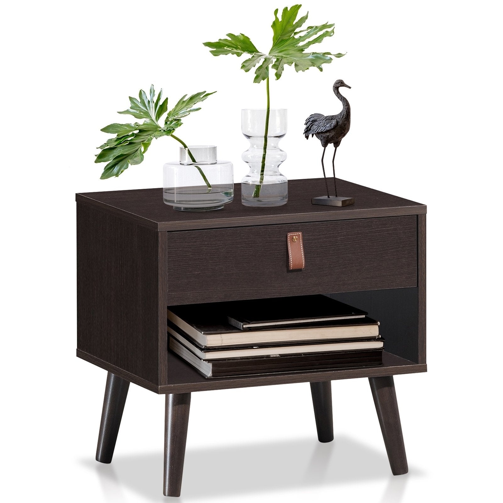 Mid-Century Wooden Nightstand with Drawer and Open Storage Shelf for Bedroom or Living Room