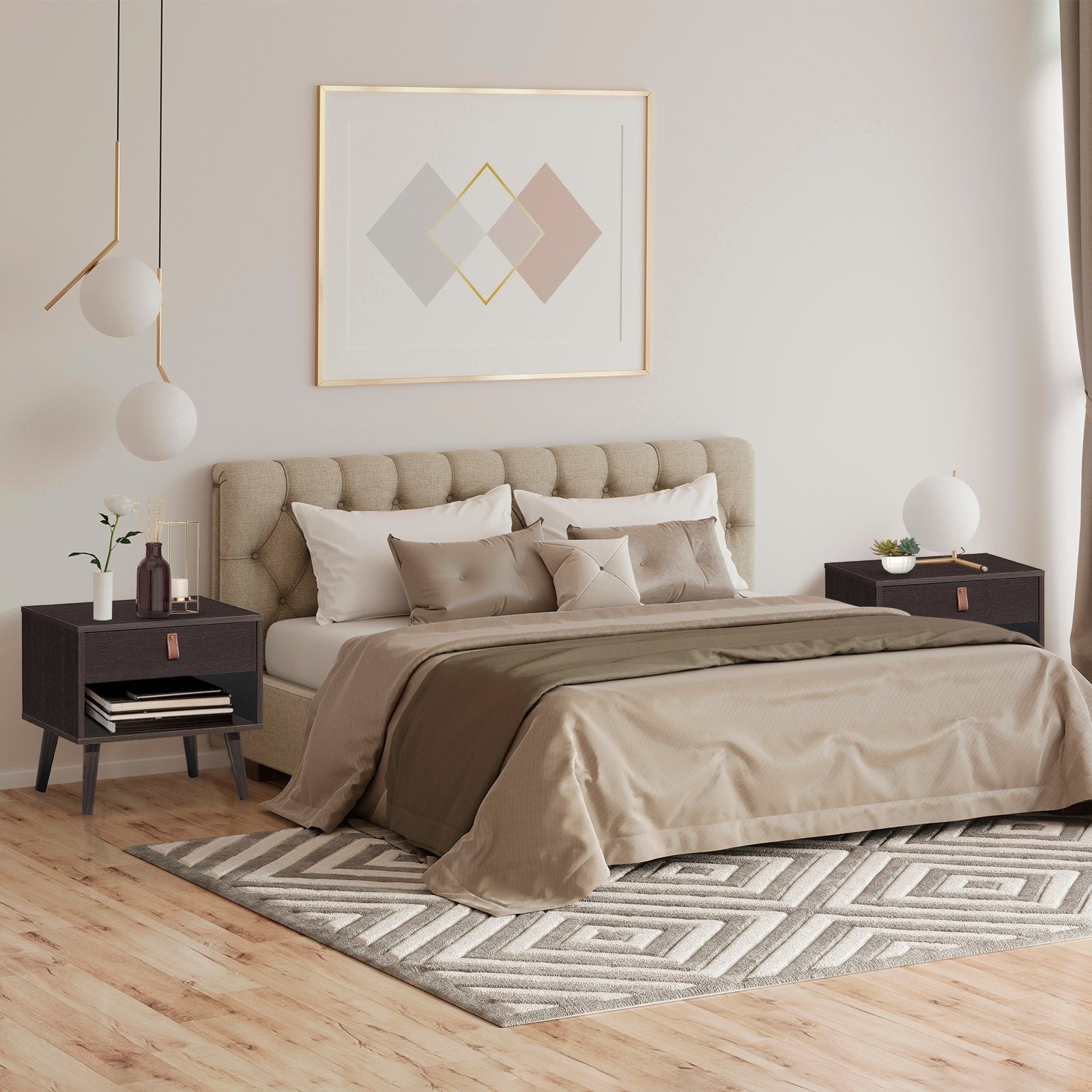Ample Storage Space: Designed with a spacious open shelf and a retractable drawer, this nightstand offers multiple storage options. The shelf is perfect for displaying cups, photo frames, and plants, while the drawer with a leather push handle provides hidden storage for personal items. The tabletop can also be used to display books, lamps, or decorative pieces.