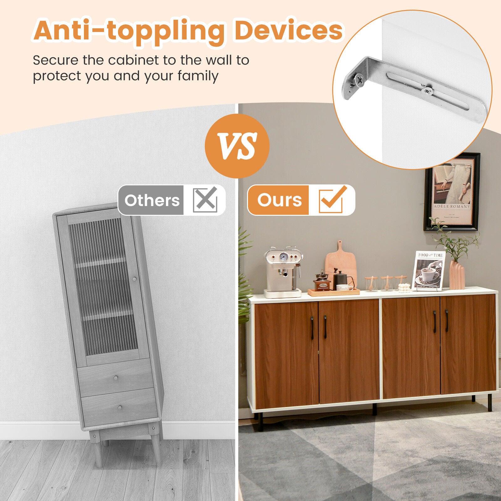 Enhanced Safety Features: Equipped with 2 anti-toppling devices, the cabinet can be securely anchored to the wall to prevent tipping. Raised 4.8" off the ground on 5 legs with anti-slip foot pads, the structure ensures secure positioning and easy cleaning access underneath.