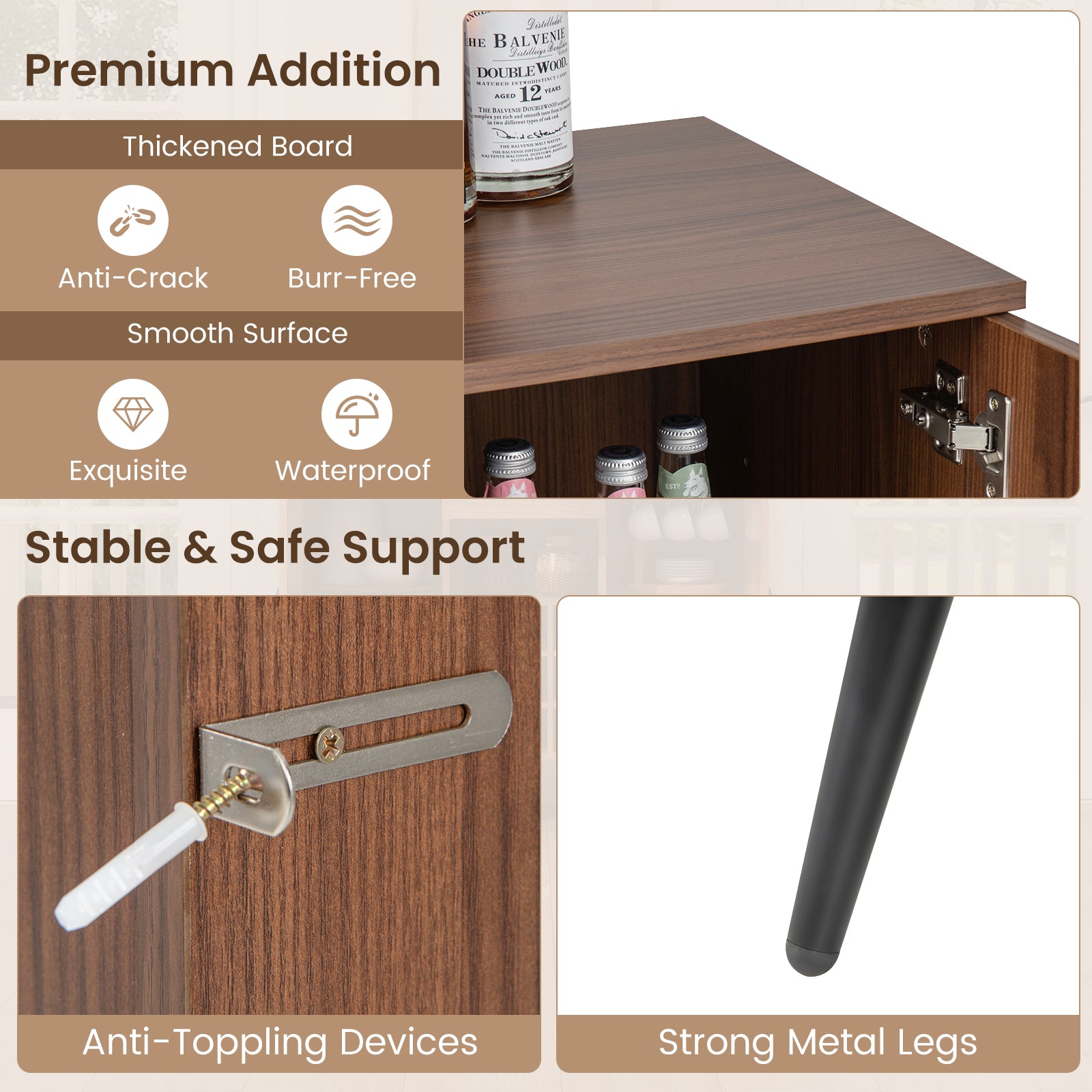 This walnut sideboard buffet cabinet offers both beauty and utility, ideal for organizing wines, dishes, or kitchen accessories in a tidy and accessible way. Featuring a removable wine rack, adjustable shelves, smooth metal hardware, and anti-tip safety kits, this modern piece is suitable for dining rooms, kitchens, or living rooms. Its mid-century inspired design and clean wood grain finish add sophistication to any space while offering smart and customizable storage solutions.