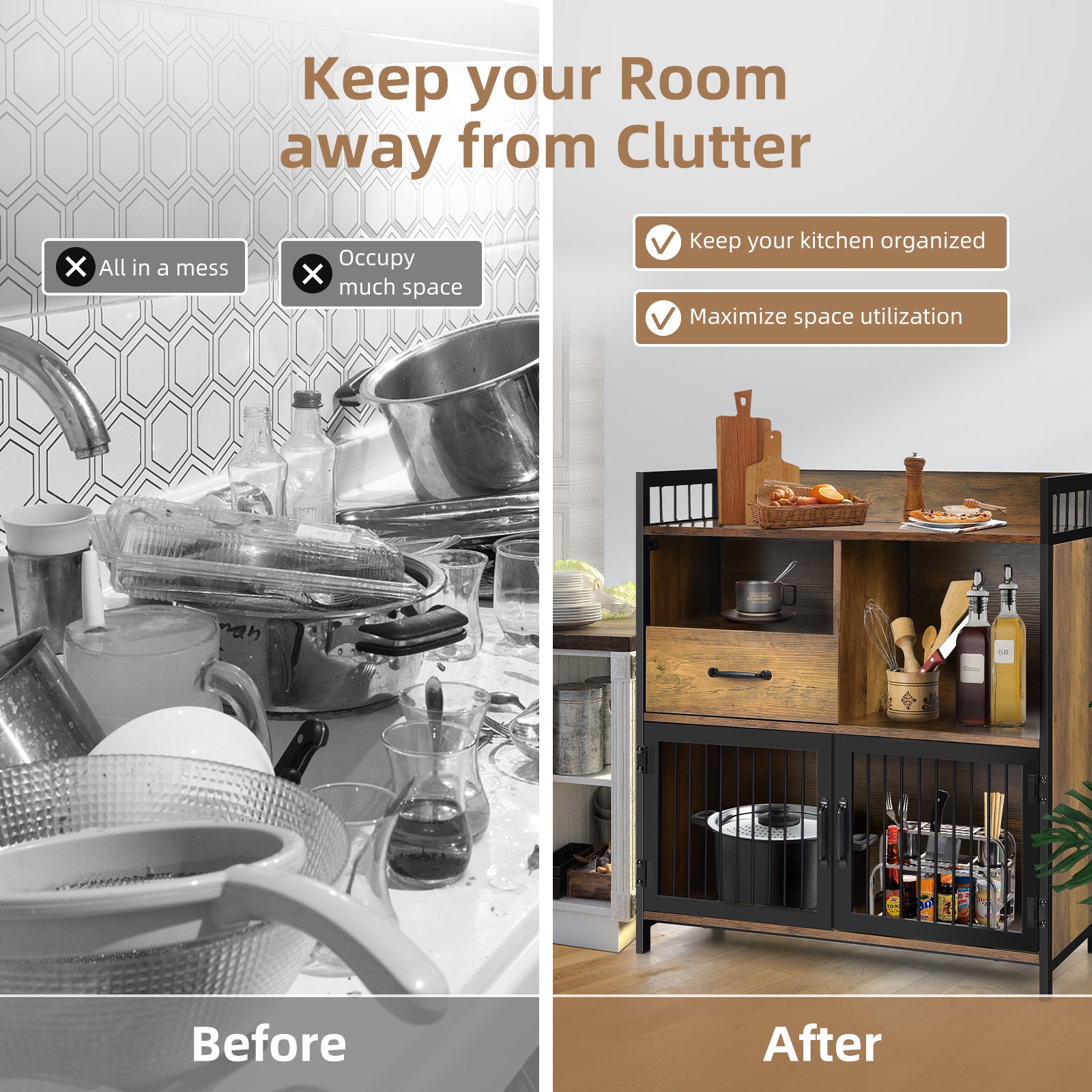 This industrial sideboard cabinet blends rustic charm with functional design, offering sturdy storage for a variety of items. Crafted from high-grade MDF and rustproof steel, it provides reliable weight support up to 145 lbs. With multiple storage sections including a wide countertop with anti-fall edges, open shelves, a pull-out drawer, and mesh steel doors, it is ideal for kitchens, dining rooms, living rooms, or offices. The non-slip foot pads enhance floor protection and stability, while the industrial look elevates your interior décor.