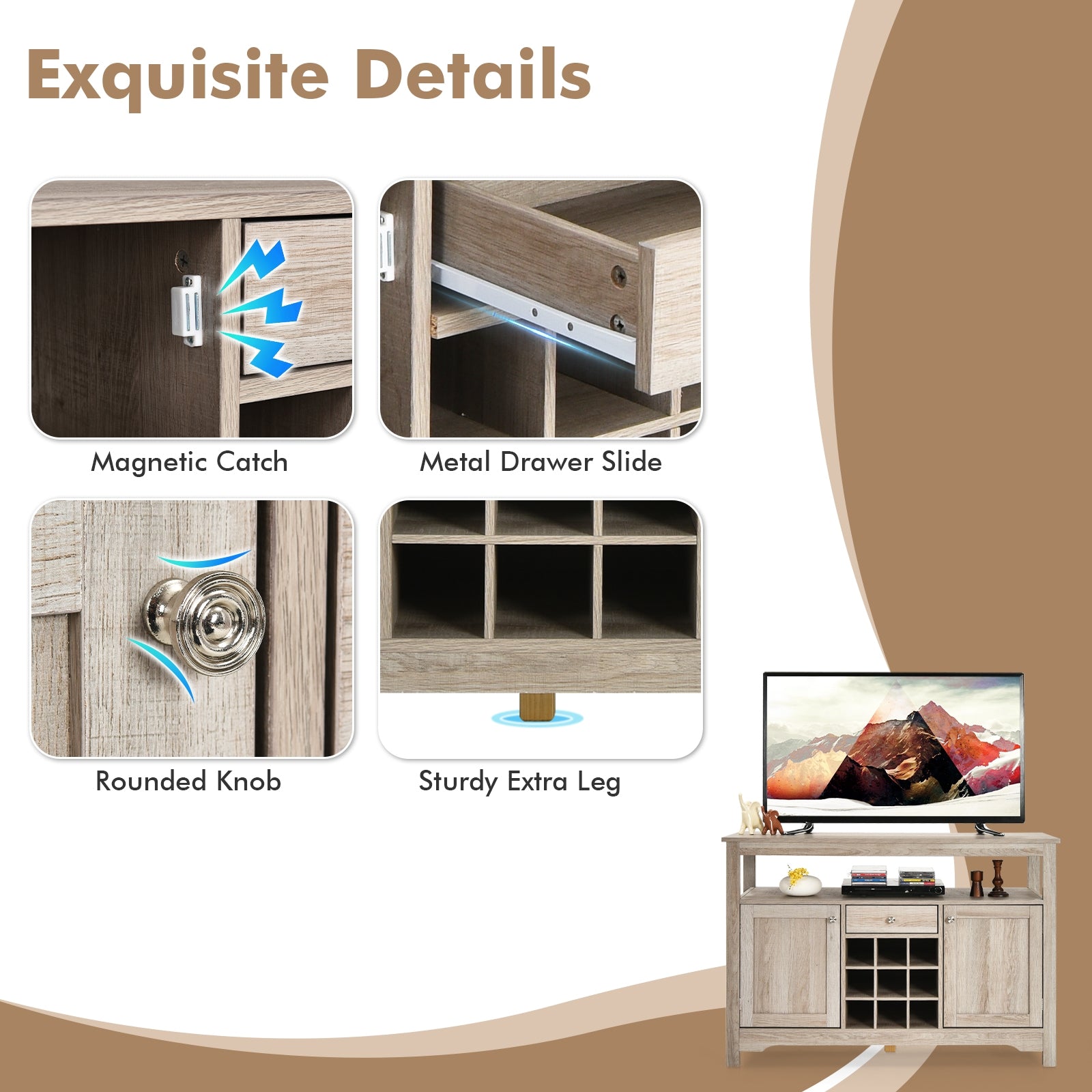 Add style and practicality to your dining or living space with this retro-inspired buffet sideboard. Featuring ample classified storage, a 9-bottle wine grid, and adjustable shelves, this unit blends decorative charm with everyday functionality. Constructed from durable P2 MDF with thickened legs and anti-tip metal accessories, it offers a sturdy and stable solution for storing kitchen essentials, displaying ornaments, and organizing bottles. Its natural textures, soft-close drawer, and easy-clean surfaces make it a versatile choice for kitchens, dining areas, and restaurants alike.