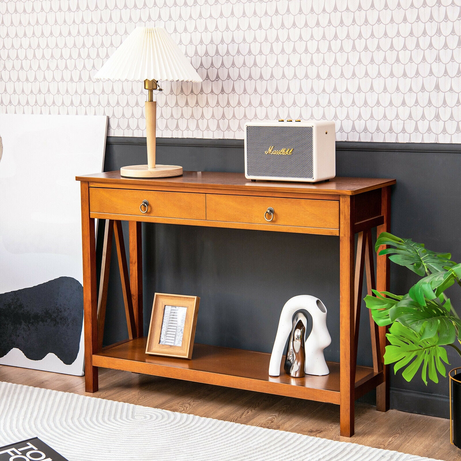 Ample Storage Space: The console table features a wide tabletop perfect for displaying plants, vases, or picture frames. Two storage drawers with smooth metal slides offer concealed space for organizing smaller items like keys, mail, or accessories. An open bottom shelf provides extra room for books, baskets, or decorative items.