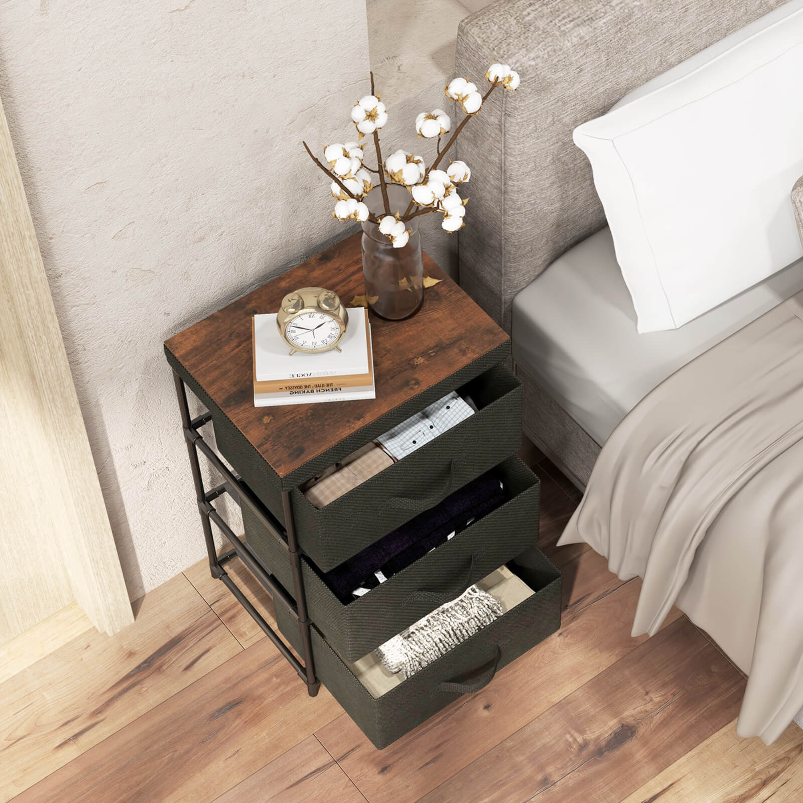 Durable Materials and Stable Build: Constructed from breathable and hard-wearing non-woven fabric, supported by a metal frame and sturdy PP connectors, this dresser offers long-term reliability. The top surface holds up to 44 pounds, ideal for lamps, books, or decorative items.