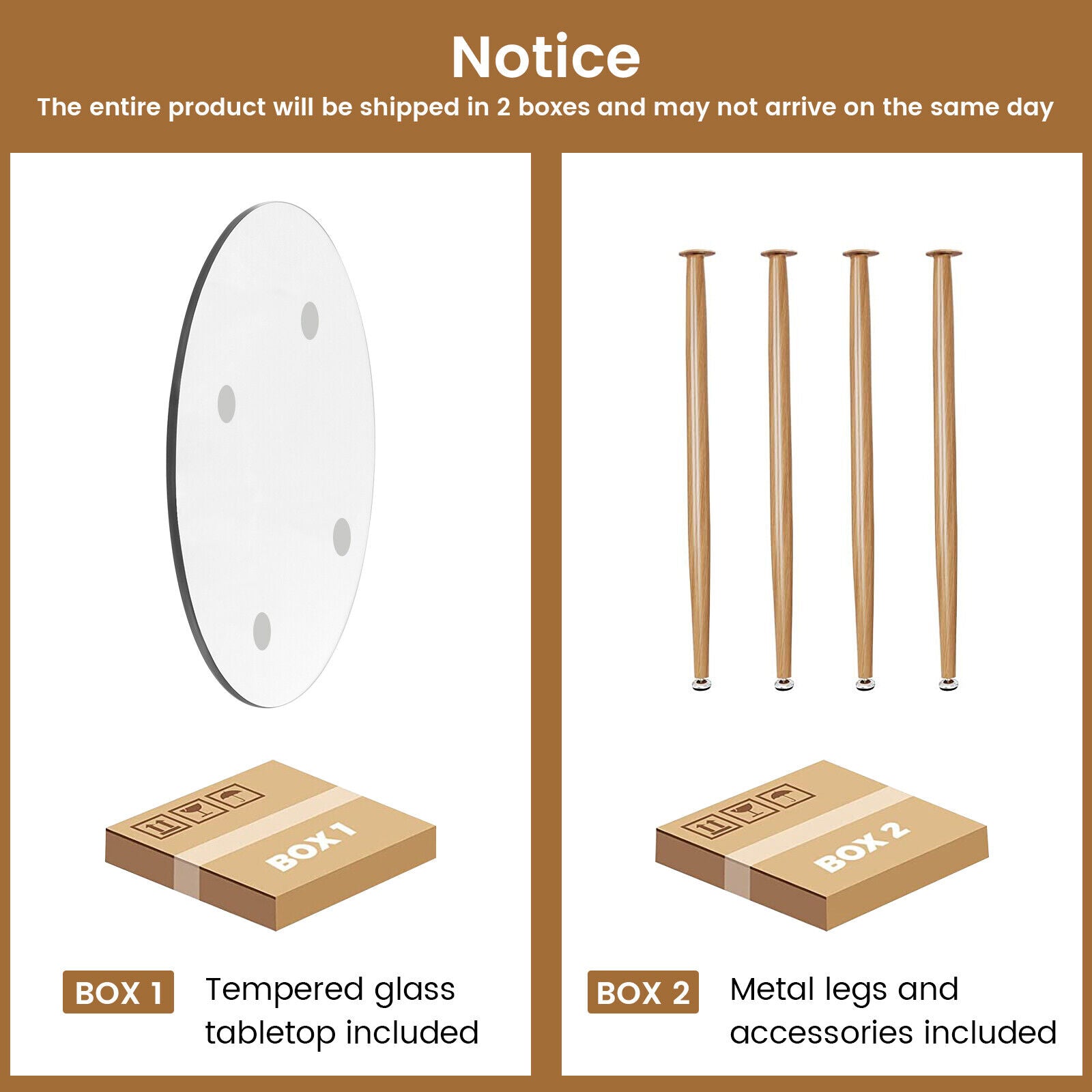 Easy Assembly and Delivery Information: The table comes with clear instructions for a straightforward assembly process. It is shipped in two separate boxes: Box 1 includes the tempered glass tabletop, while Box 2 contains the metal legs and all necessary accessories. Delivery may occur on different days.