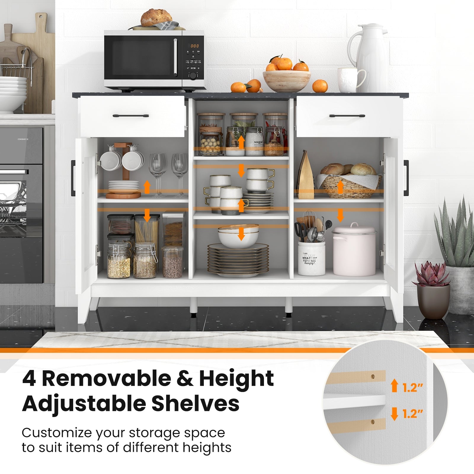 Ample Storage Space: Equipped with 3 open shelves, 2 deep drawers, 2 door cabinets, and 4 adjustable shelves, this cabinet provides generous space for organizing kitchen tools, dining essentials, or decorative pieces. The spacious top surface can accommodate small appliances or be styled with decor.