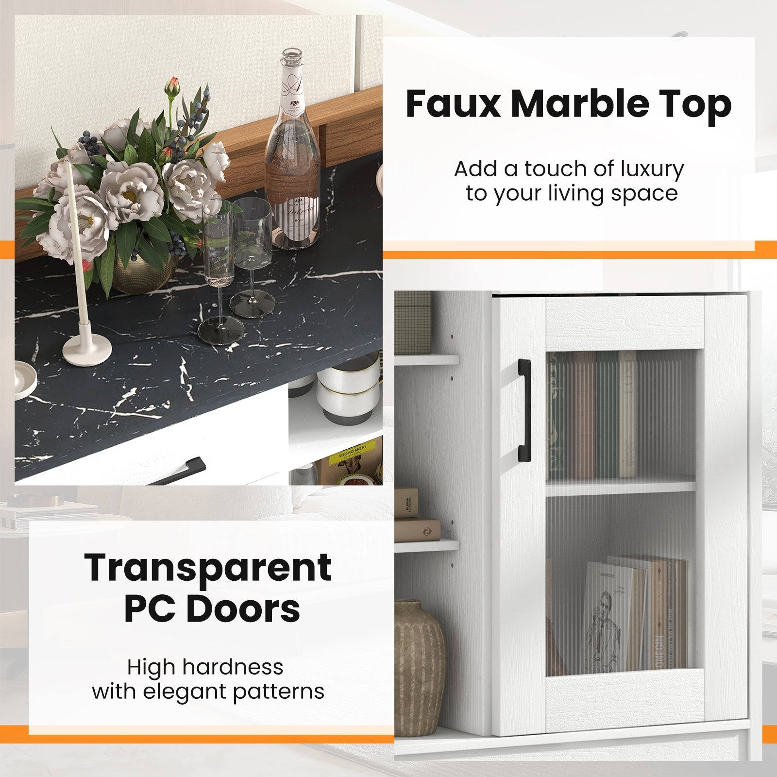 This multifunctional sideboard buffet cabinet features a blend of elegant design and practical utility, making it a perfect fit for your kitchen, dining room, or living space. With 3 open shelves, 2 drawers, and 2 enclosed cabinets with transparent doors, it offers ample organized storage. The faux marble top adds a luxurious accent while the adjustable shelves provide flexible storage. Safety and stability are ensured with anti-tipping devices and additional support legs, making it a reliable addition to modern interiors.