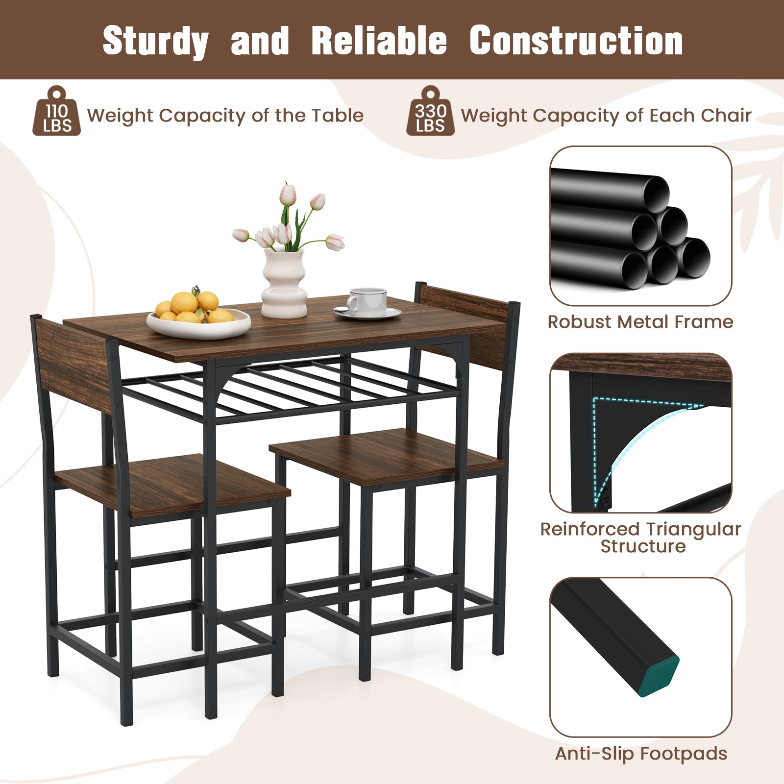 3-Piece Dining Table Set with Storage Rack and Metal Frame for Small Spaces, Rustic Brown