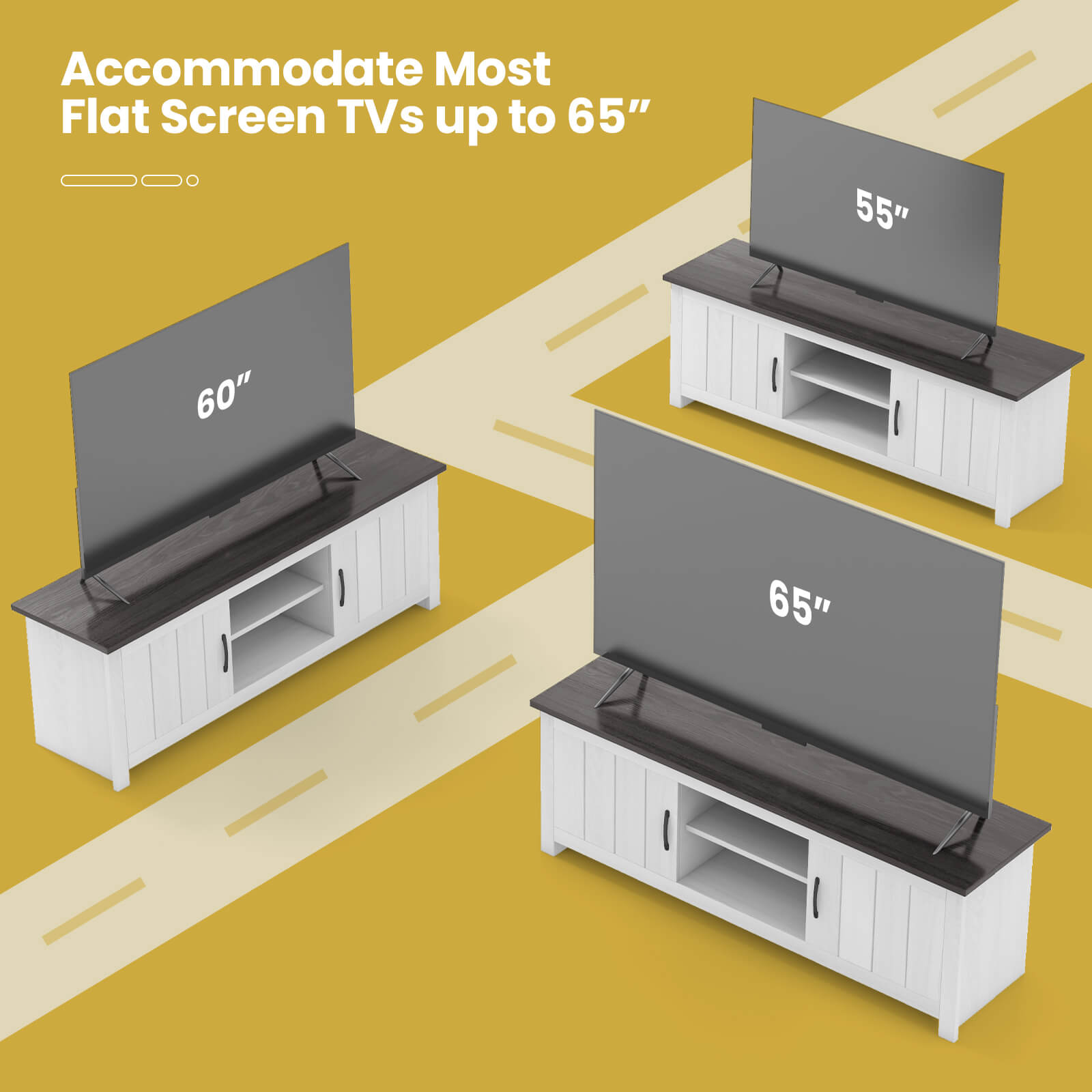 This modern TV stand offers a spacious tabletop that supports flat screen TVs up to 65 inches, combining sleek design with practical storage. Crafted from thick engineered wood, it promises durability and stability. With two large cabinets and open shelves, this media console keeps your living area organized and stylish. The stand also features cable management holes to maintain a tidy space and non-slip foot pads to protect your floor. Its versatile style fits well in any room, serving as a TV stand, media console, or storage cabinet. Assembly is easy with detailed instructions included.