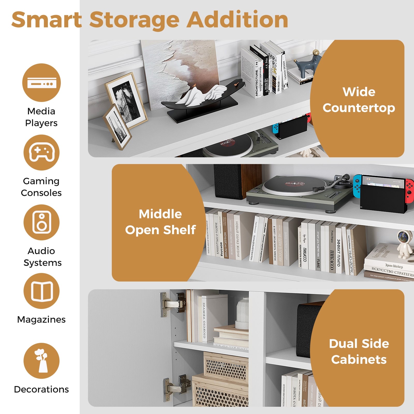 Smart Storage Addition: Equipped with two side cabinets and a central open shelf, the media console table offers plenty of storage for audio equipment, gaming consoles, DVDs, and other media supplies while keeping the area tidy and accessible.