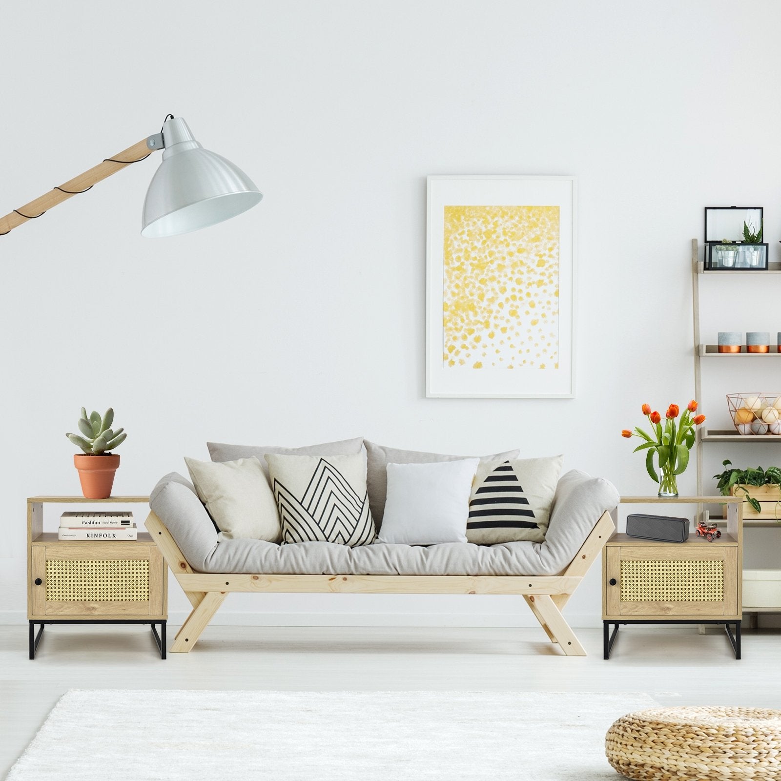 This versatile nightstand is designed to complement various spaces in your home, including the bedroom, living room, or entryway. Whether used as a nightstand, sofa side table, or end table, it provides a perfect blend of functionality and style. Constructed from engineered wood and supported by a durable steel frame, it offers exceptional stability and long-lasting use. With a spacious tabletop, an open shelf, and a cabinet, it conveniently stores everything from your bedtime essentials to decorative items. The rattan-decorated door adds a charming touch, while the waterproof and anti-scratch surface ensures easy maintenance. Assembly is quick and hassle-free with the included detailed instructions.