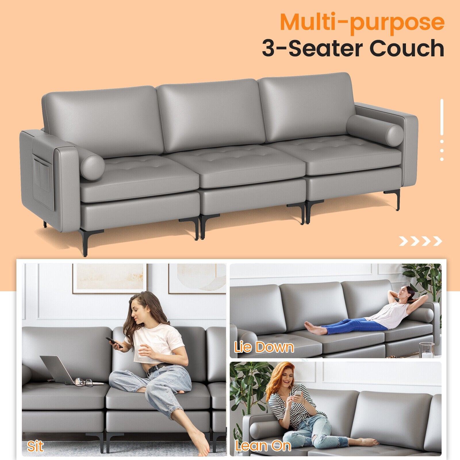 This modular 3-seat sofa couch is designed to bring style, comfort, and functionality to your living space. Upholstered in wear-resistant leathaire fabric, it features a spacious seating area, removable bolsters, and a side storage pocket for added convenience. Its modular design allows for various configurations, making it suitable for different room layouts. With a steel backrest equipped with USB ports, a 3-hole socket, and a hidden storage box, this sofa provides modern utility alongside superior comfort. The firm frame, supported by solid metal legs and non-slip foot pads, ensures stability and long-lasting use. Perfect for living rooms, bedrooms, studies, or offices, this sofa delivers both elegance and practicality.