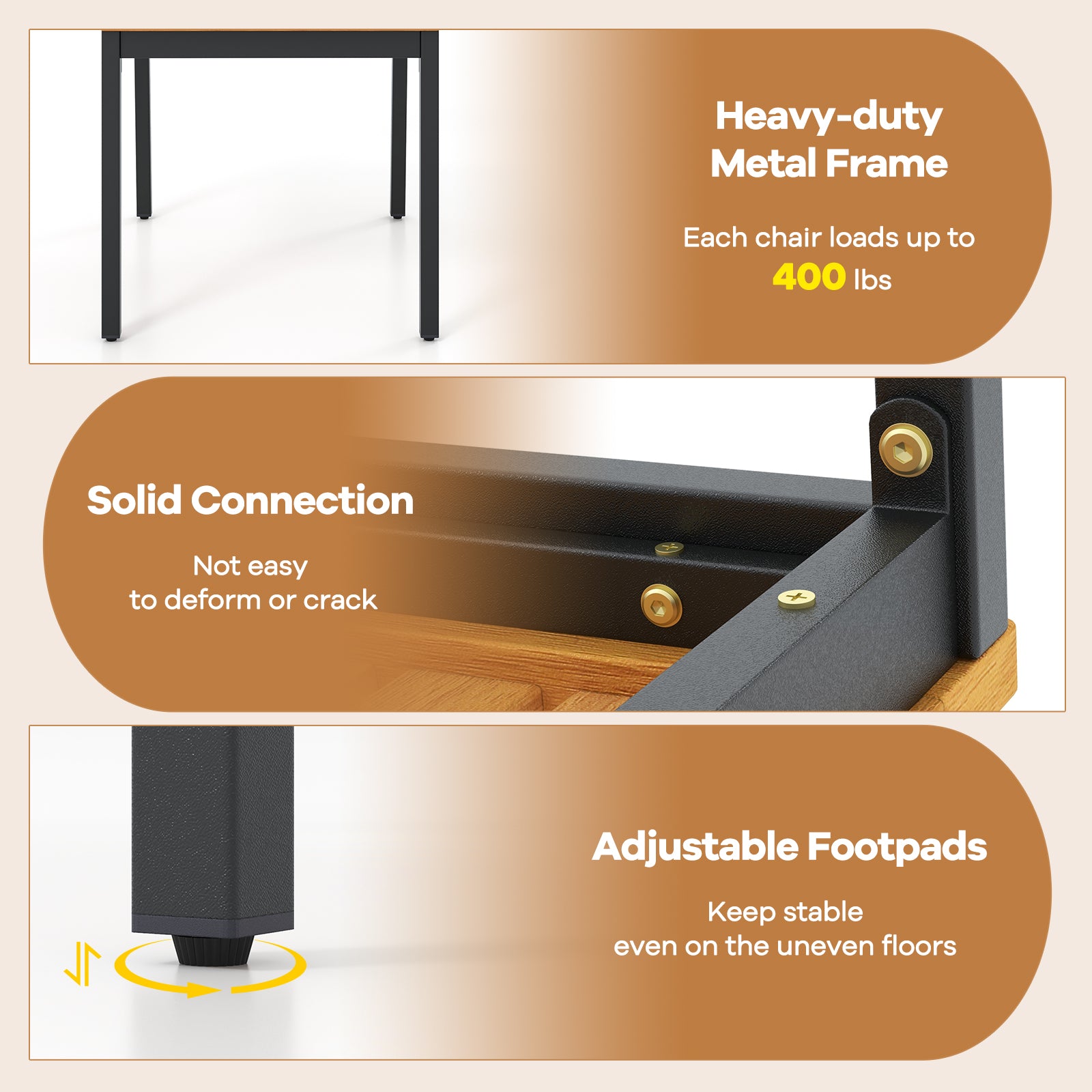 Sturdy and Reliable Construction: The chairs are supported by a heavy-duty metal frame that offers excellent load-bearing capacity. Each chair supports up to 400 lbs or 180 kg. Reinforced joints and solid metal tubing provide stability and durability. Adjustable footpads at the bottom of each leg enhance balance and reduce wobbling on uneven surfaces.