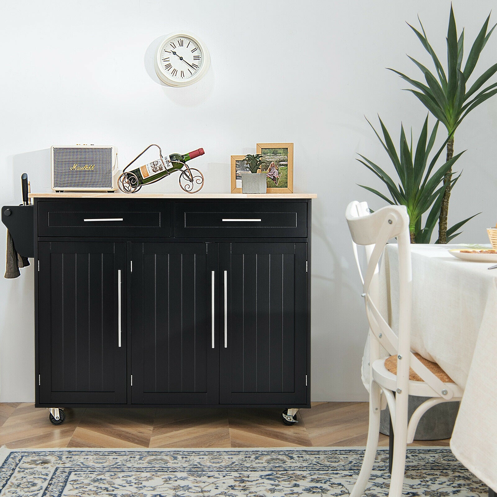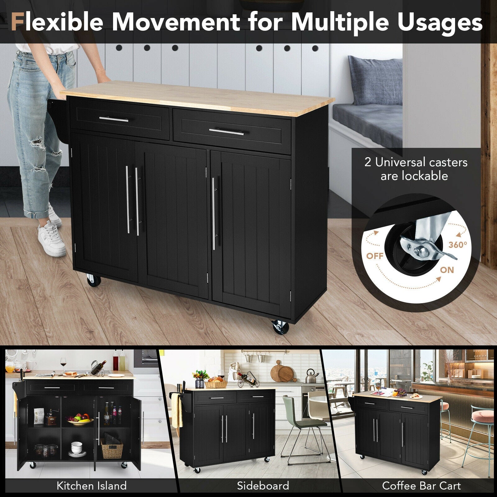 Rolling Kitchen Island Cart with Wood Top Storage Cabinets Drawers and Knife Block - Black